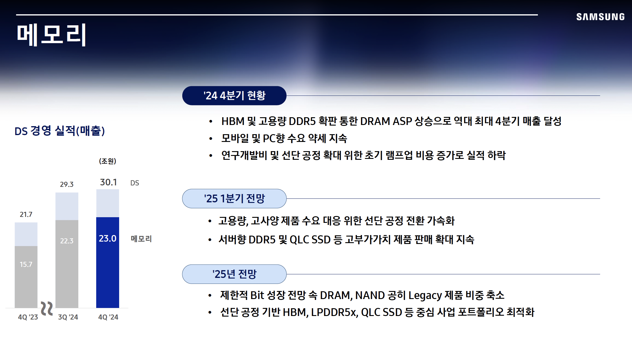 하지만 DS 부문은 최근 파운드리 사업의 낮은 수율 문제로 인해 어려움을 겪고 있으며, AI 반도체 시장에서 경쟁력을 확보해야 하는 과제를 안고 있다.