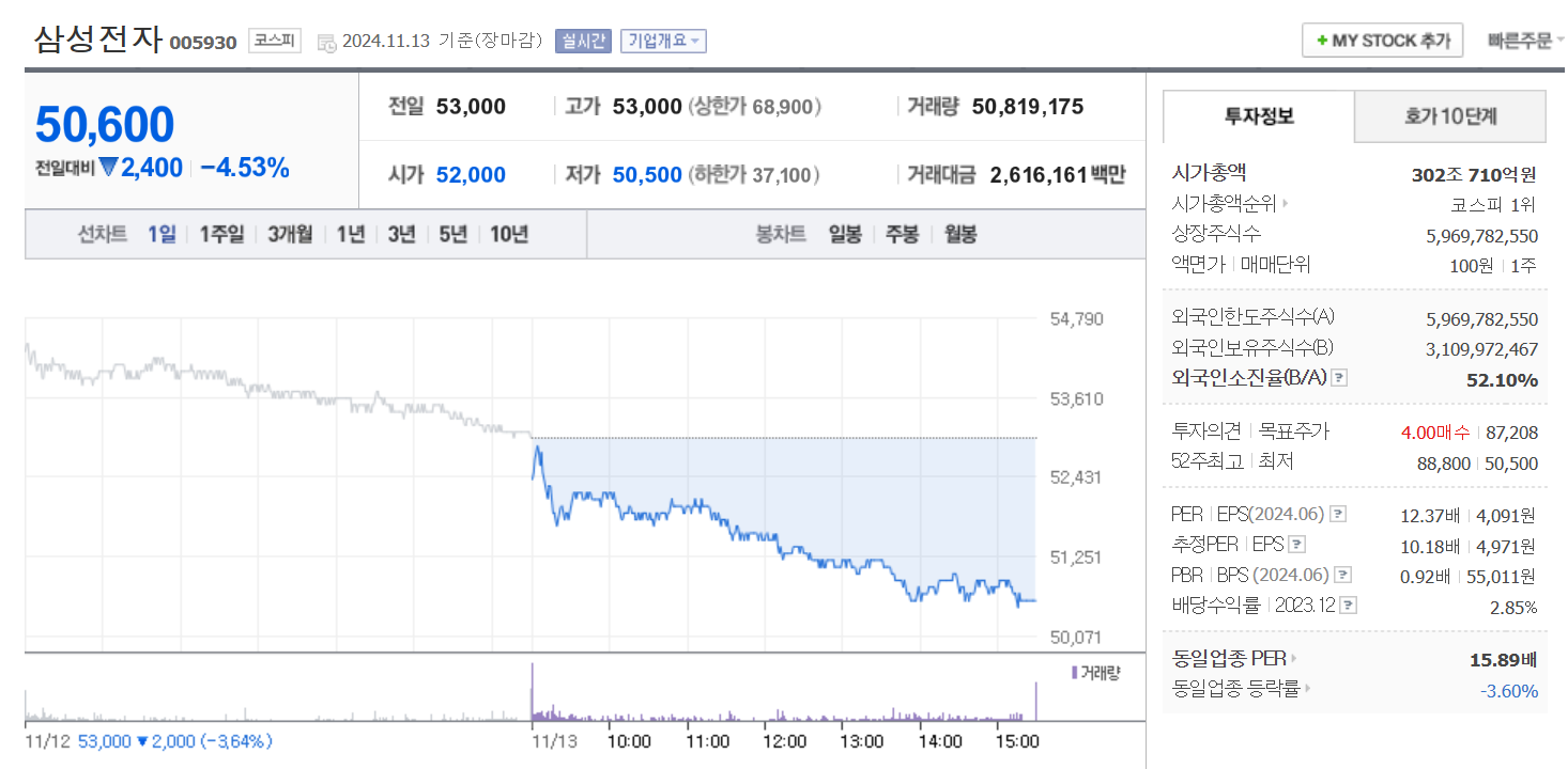 삼성전자가 연이은 악재로 인해 4년 5개월 만에 최저가로 떨어지며 주가가 큰 폭으로 하락하고 있습니다. 특히, 글로벌 경제와 정치적 불확실성 속에서 AI 반도체 분야에서의 경쟁력 약화가 주된 원인으로 지목되고 있으며, 여기에 미국 대선 결과에 따른 변수도 더해지면서 주식 시장의 우려가 커지고 있습니다. 삼성전자는 고대역폭 메모리(HBM)와 같은 고성능 반도체 분야에서 AI 시대의 핵심 기술을 선도하기 위해 막대한 투자를 이어가고 있지만, 경쟁사와의 기술 격차가 여전하다는 분석이 나오고 있습니다.