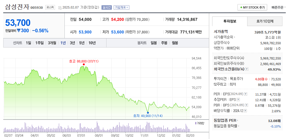 - 이는 코스피 시장에서 가장 큰 비중을 차지하는 종목으로, 삼성전자의 하락이 한국 증시 전체에 미치는 영향도 크다는 것을 의미합니다.