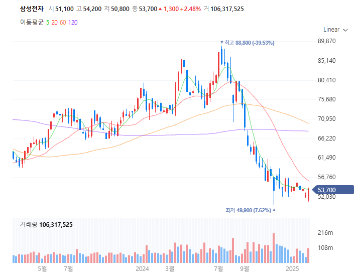 2020년 코로나19 이후 삼성전자의 주가는 9만 원을 넘보며 ‘10만전자’ 라는 기대감을 심어주었지만, 2024년 들어 급격한 하락세를 보이며 5만 원대까지 주저앉았습니다.