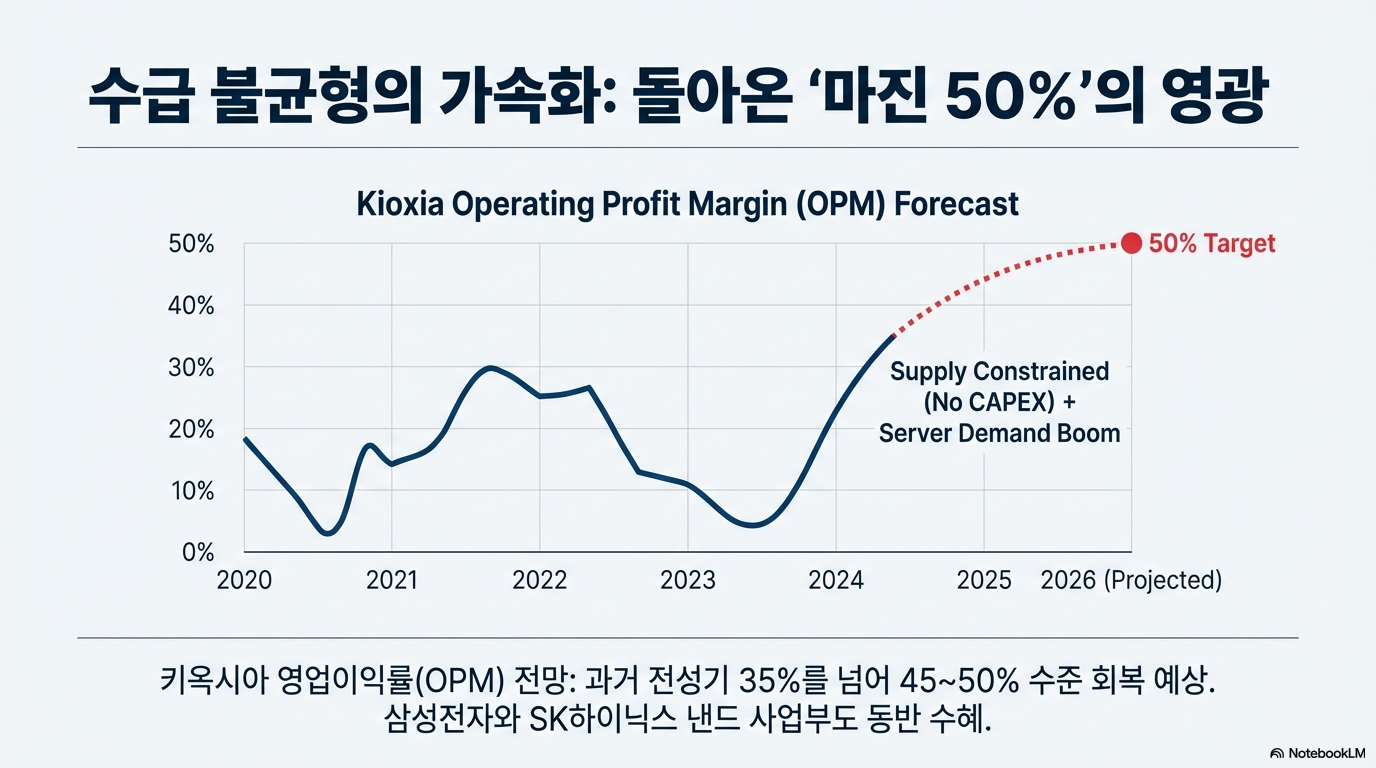 하지만 최근 키옥시아의 행보는 180도 달라졌습니다. 과거의 헐값 매각 관행을 끊고 '배짱 있는 제값 받기'로 선회한 것입니다. 특히 **2026년 1분기 예상 가격 인상 폭을 무려 50%**로 잡았다는 가이드라인은 시장을 깜짝 놀라게 했습니다. 이는 단순히 숫자의 변화가 아니라, 공급자가 가격 결정권을 쥐기 시작했다는 강력한 시그널입니다.