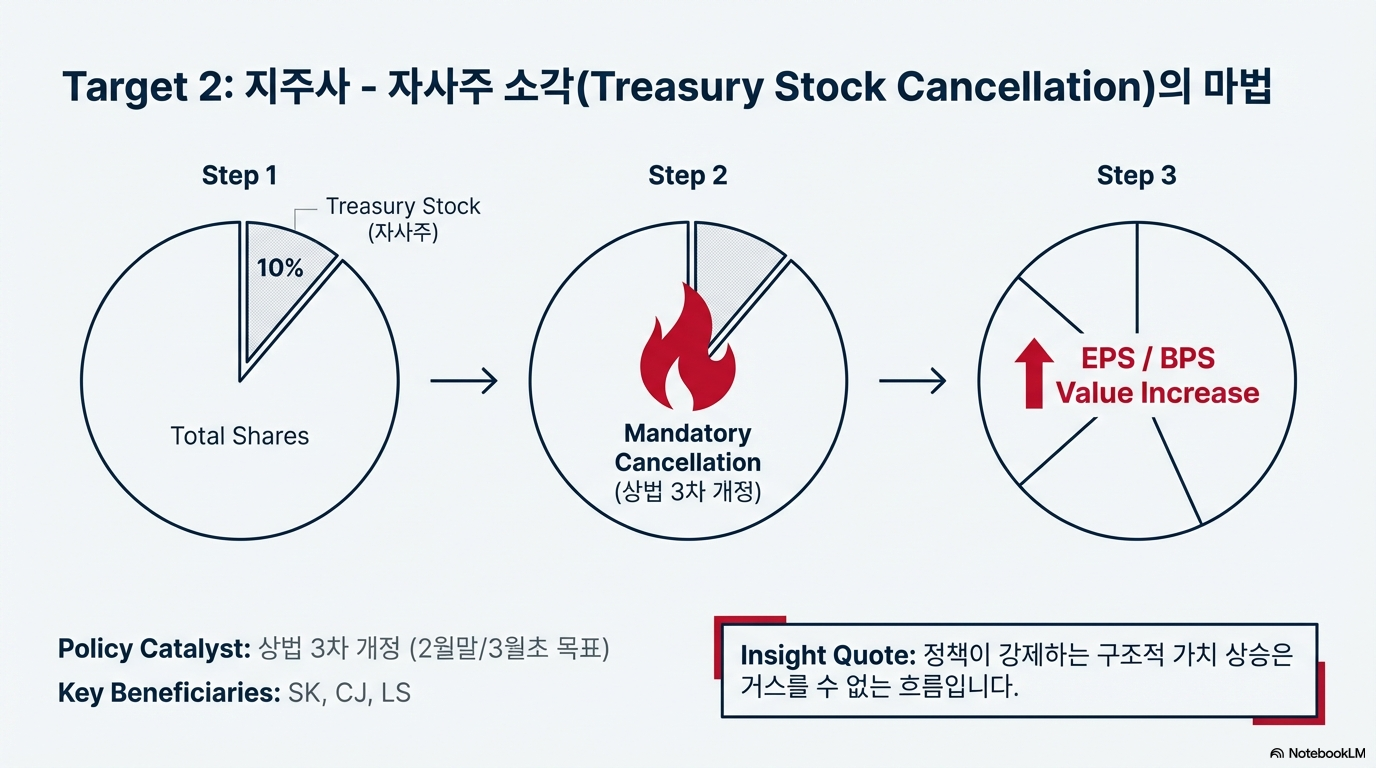 주목할 점은 이 과정이 주도주의 급락이 아닌, 소외되었던 저평가주들의 '구조적 재평가'를 통해 이루어질 가능성이 높다는 것입니다. 특히 **2월 말에서 3월 초로 예정된 3차 상법 개정(자사주 의무 소각 등)**은 단순한 정책 변화를 넘어, 한국 증시의 DNA를 '외형 성장'에서 '주주 가치 제고'로 바꾸는 변곡점이 될 것입니다. 과거에는 '이유 있는 저평가'였던 종목들이 이제는 정책적 모멘텀과 유동성이라는 강력한 날개를 달게 되었습니다.