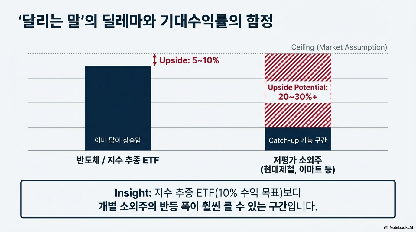 삼성전자가 5% 상승 여력을 가질 때, 현대제철과 같은 저평가주가 15~20%의 상승 룸(Room)을 가지고 있다면 전략가의 선택은 명확합니다. 지수 ETF에만 자금이 쏠리는 현상은 '안전의 함정'일 수 있습니다. 이제는 포트폴리오의 효율성을 극대화하기 위해 '기대 수익률이 더 높은 곳'으로 자산을 재배분하는 결단이 필요합니다.