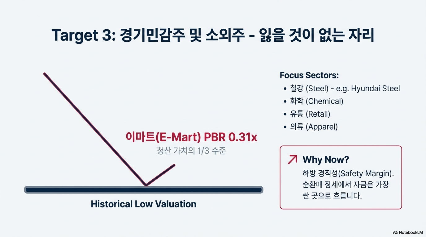 • 소비 및 유통 (전략적 회귀): 아모레퍼시픽(중국 의존 탈피 및 미국 시장 확대), 이마트(PBR 0.31배) 등은 과도한 저평가 영역에서 유동성 유입의 직접적인 수혜를 입을 준비를 마쳤습니다.