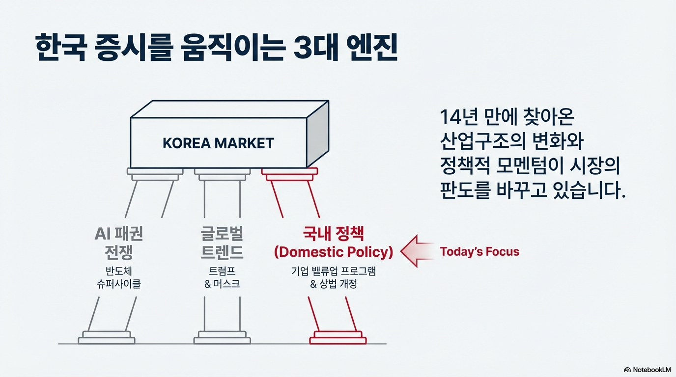 주목할 점은 이 과정이 주도주의 급락이 아닌, 소외되었던 저평가주들의 '구조적 재평가'를 통해 이루어질 가능성이 높다는 것입니다. 특히 **2월 말에서 3월 초로 예정된 3차 상법 개정(자사주 의무 소각 등)**은 단순한 정책 변화를 넘어, 한국 증시의 DNA를 '외형 성장'에서 '주주 가치 제고'로 바꾸는 변곡점이 될 것입니다. 과거에는 '이유 있는 저평가'였던 종목들이 이제는 정책적 모멘텀과 유동성이라는 강력한 날개를 달게 되었습니다.