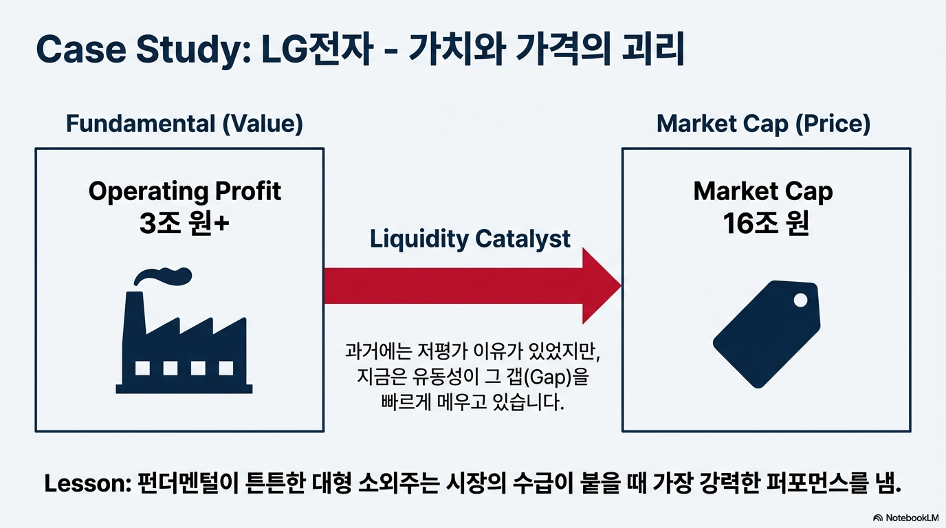 • LG전자 (시장의 모순): 연간 영업이익이 3조 원을 상회함에도 시가총액은 고작 16~17조 원 수준입니다. 이는 고유동성 장세에서 지속되기 어려운 '시장 왜곡' 사례이며, 강력한 되돌림이 예상됩니다.