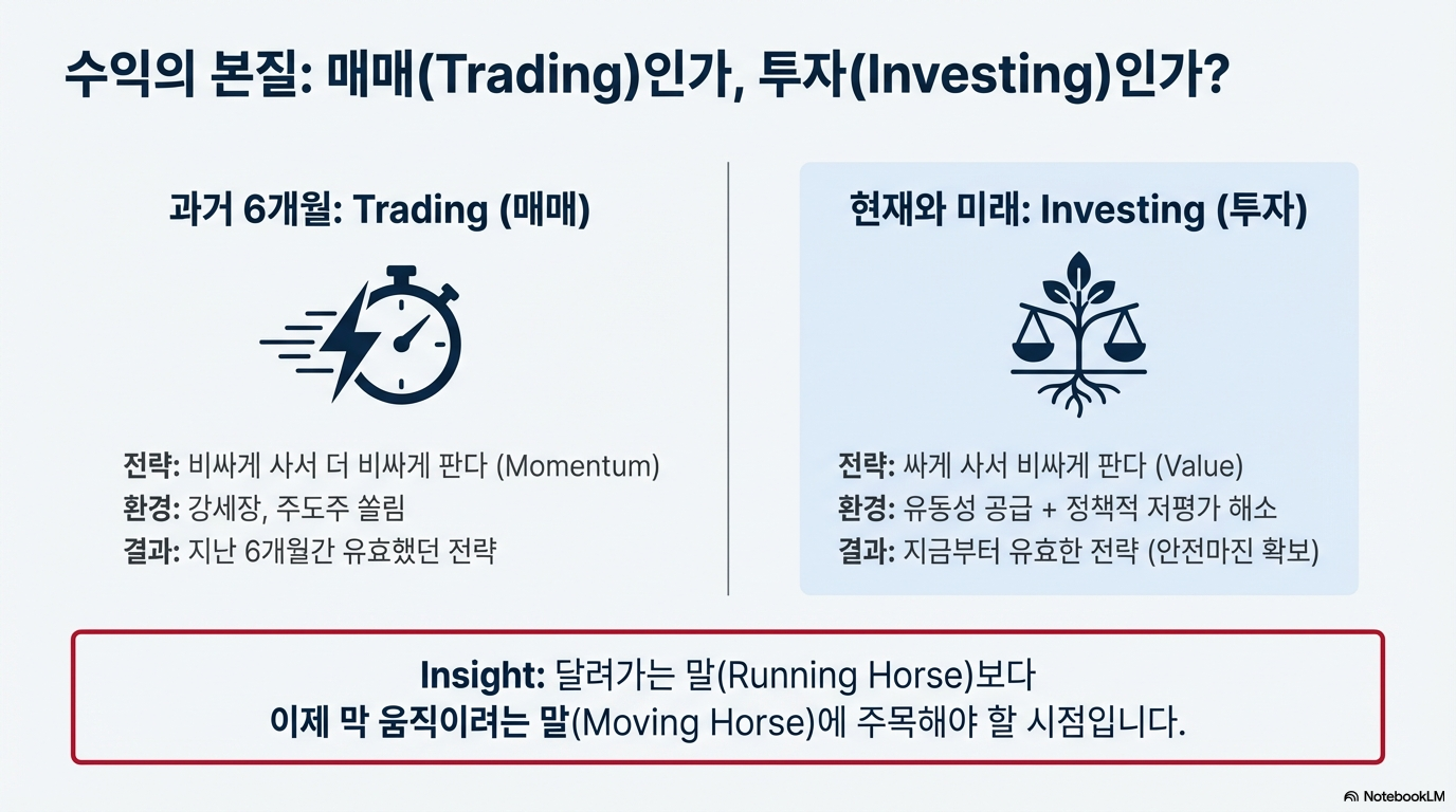 전략가는 지금 '투자의 관점'으로 회귀할 것을 권고합니다. 지수가 일정 수준에 도달한 상황에서, 고점 부근의 주도주를 추격하는 것은 하방 리스크는 크고 상방 여력은 제한적인 '부정적 비대칭성'을 갖기 때문입니다. 반면, 바닥에서 고개를 들기 시작한 저평가 우량주는 하락장은 방어하면서도 상승 시 폭발적인 탄력을 보여주는 '긍정적 비대칭 수익비'를 제공합니다.