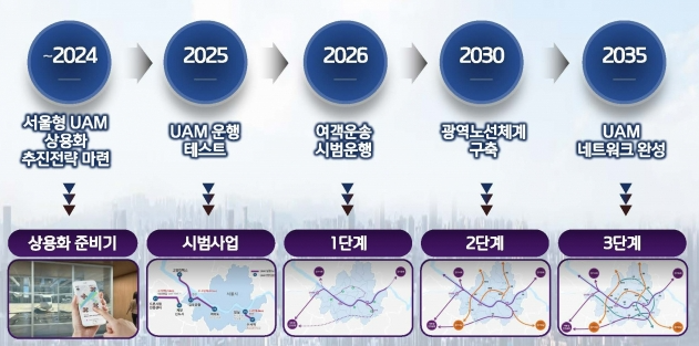 서울시는 UAM 실증을 2025년부터 여의도와 한강을 중심으로 시작하여, 2030년 상용화를 목표로 단계적으로 확장할 계획입니다. 이는 초기에는 주요 거점을 중심으로 운영되다가, 시간이 지남에 따라 서울과 수도권 전역으로 확대되어, 2040년까지는 입체적인 교통망을 완성하는 것을 목표로 합니다. 이러한 단계적 접근을 통해 기술적 안정성과 실용성을 충분히 확보하고, 시민들이 신뢰할 수 있는 교통수단으로 자리잡도록 할 계획입니다.