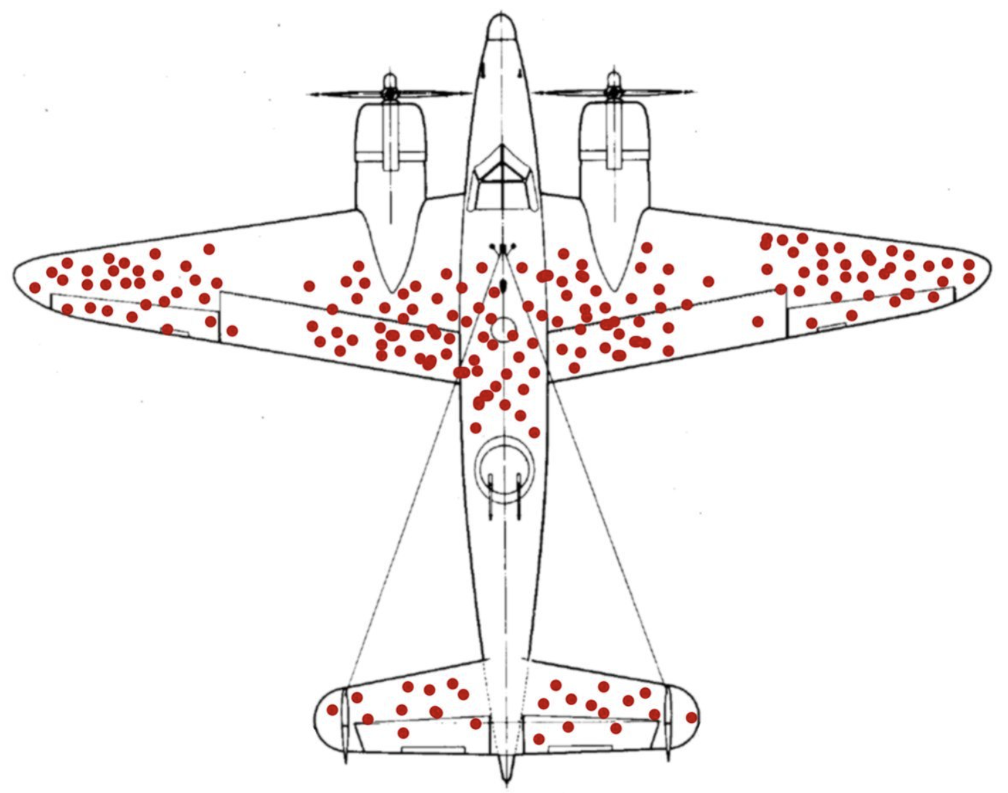 전쟁 중 미 해군은 전투기가 전장에서 살아남아 돌아올 때마다 손상된 부분을 분석하여 강화하려고 했습니다. 처음에는 돌아온 전투기의 손상된 부분을 중심으로 보강을 하려고 했습니다. 하지만, 이는 중요한 생존 편향의 오류를 범하는 것이었습니다.