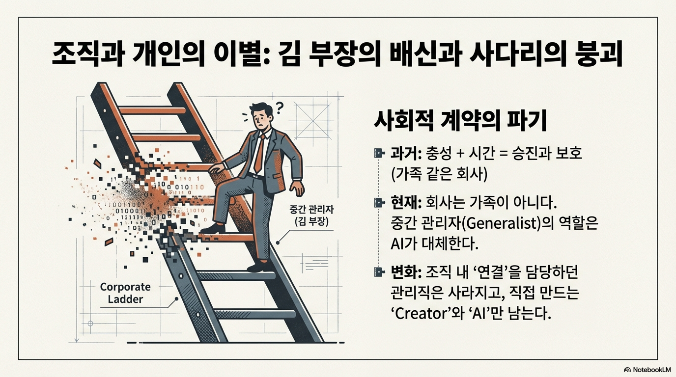 이러한 양측의 생각이 충돌하면서, 과거의 끈끈했던 조직 문화는 무너지고 있습니다. 개인은 조직 밖에서 생존을 모색하고, 조직은 개인 없이도 운영될 시스템을 구축하며 서로 다른 길을 걷기 시작한 것입니다.