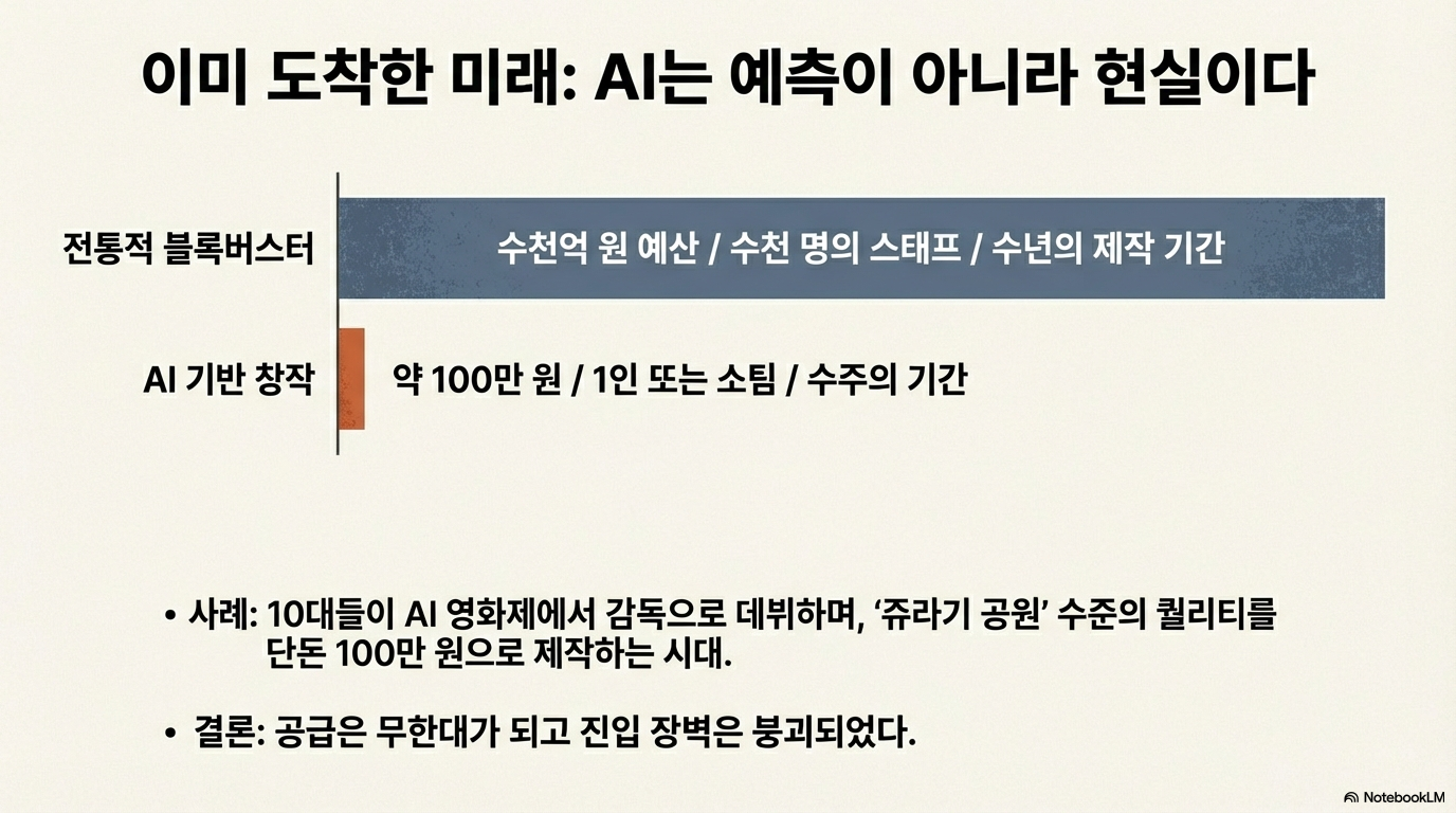 AI는 영화, 음악, 글 등 모든 콘텐츠의 생산 단가를 극적으로 낮추고 생산량을 무한대로 늘리고 있습니다. 100만 원이면 한 시간짜리 영화를 만들고, 누구나 작곡가가 될 수 있는 시대입니다.