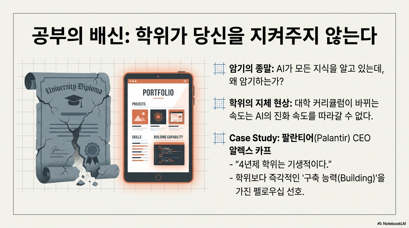 데이터 분석 기업 팔란티어(Palantir)의 CEO는 "대학 4년 교육은 기생적(parasite)"이라고 비판하며, 아예 대학 졸업자를 받지 않는 펠로우십 프로그램을 만들었습니다. 이는 정해진 지식을 배우는 것보다 '무언가를 직접 만드는 능력(Building)'이 압도적으로 중요해졌음을 시사합니다.