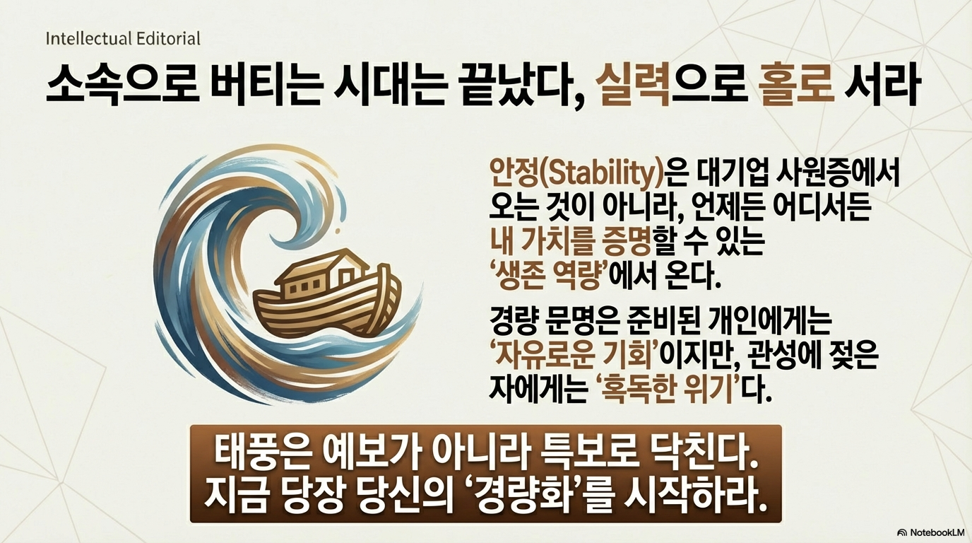 이는 단순히 기술의 발전만을 의미하지 않습니다. 지난 200년간 우리의 일과 삶을 지배해 온 산업화 시대의 '무거운(heavy)' 규칙들이 근본적으로 해체되고 있음을 뜻합니다. 정해진 공장에 모여 출퇴근하고, 조직의 사다리를 오르고, 규모를 키워 경쟁하던 시대가 끝나가고 있다는 것입니다.