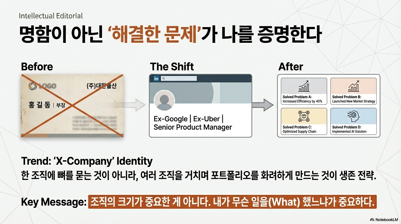 새로운 시대의 성공적인 커리어는 링크드인 프로필에 찍히는 'X Google', 'X Uber'와 같은 이력들입니다. 이는 한 조직에 대한 충성도가 아니라, 여러 조직을 거치며 쌓은 다채로운 경험의 깊이를 증명하는 새로운 훈장이 되었습니다.