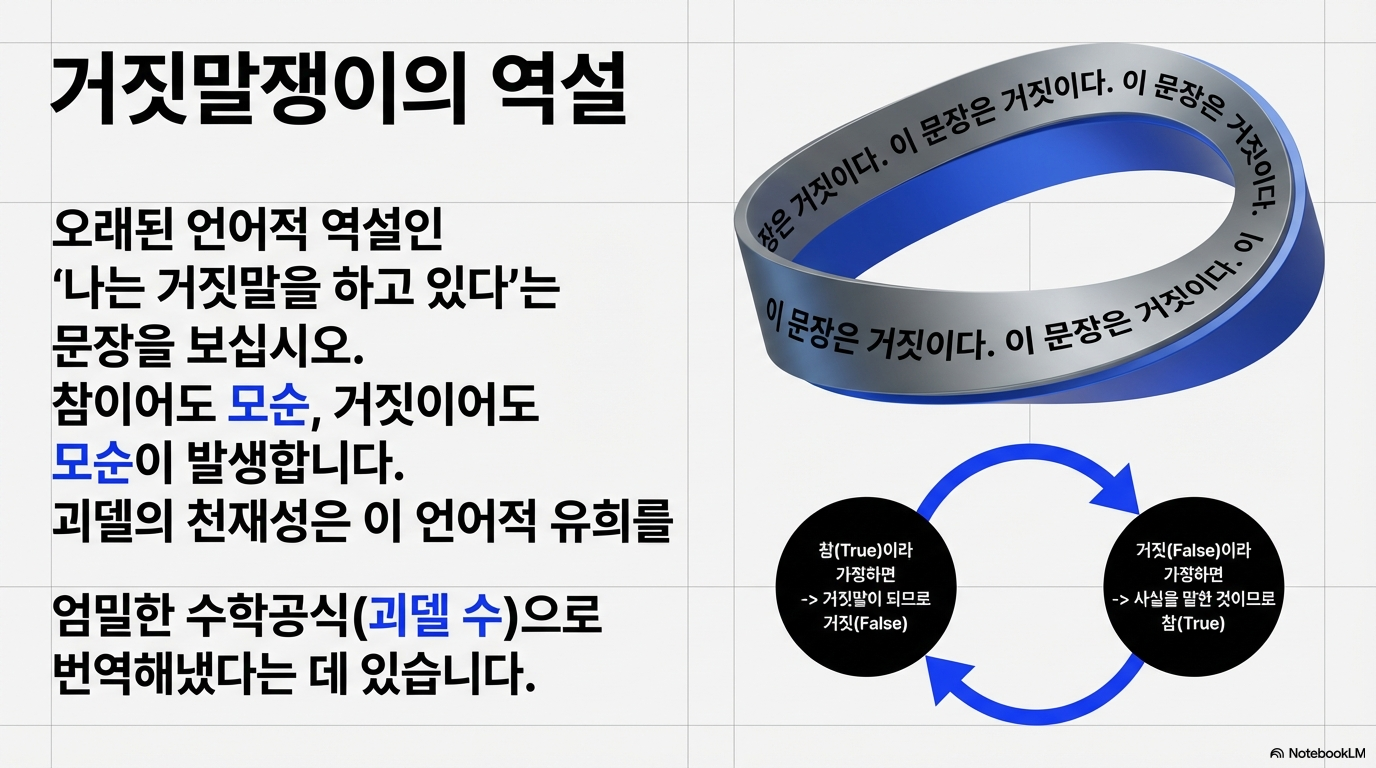 괴델은 이 결론을 도출하기 위해 아주 오래된 논리적 도구인 '거짓말쟁이의 역설'을 수학의 세계로 끌어들였습니다. "나는 지금 거짓말을 하고 있다"라는 문장은 참이라고 해도 모순, 거짓이라고 해도 모순이 생깁니다. 괴델은 이 기묘한 논리를 **'명제 P'**라는 수학적 기호로 변환했습니다.