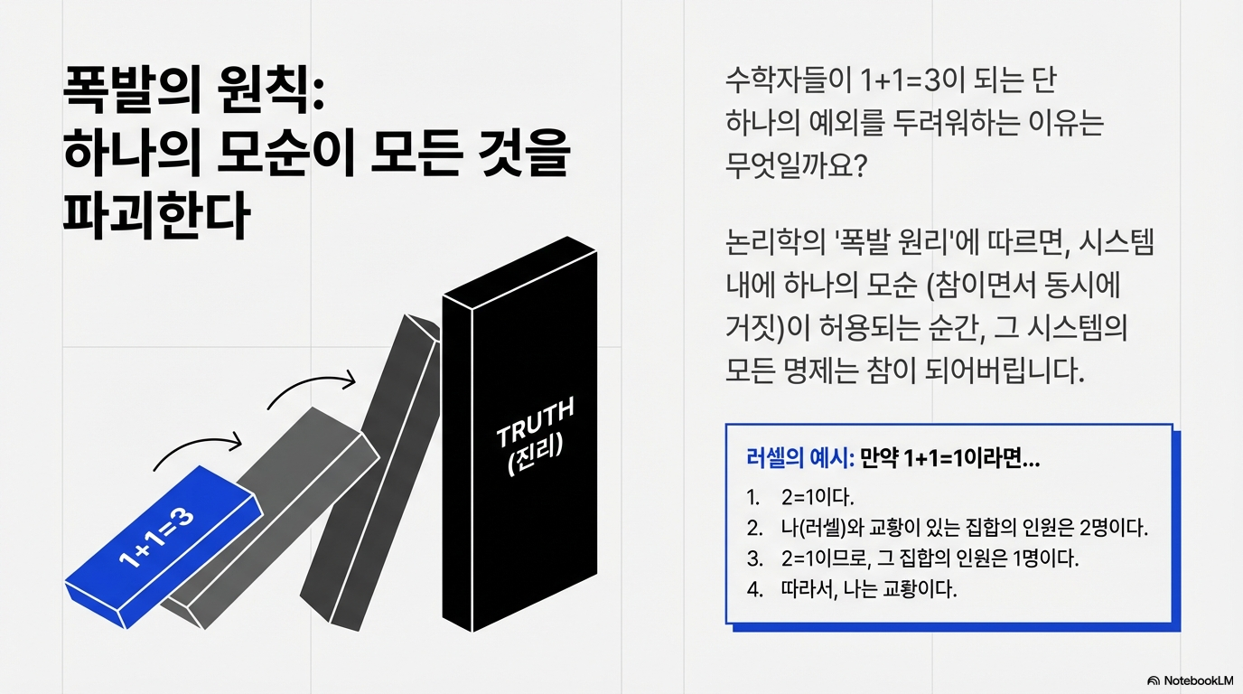 수학자들이 이토록 증명에 집착한 이유는 무엇일까요? 바로 '모순'에 대한 공포 때문입니다. 수학 체계 내에서 단 하나의 모순이라도 참으로 인정되는 순간, 수학의 모든 명제가 참인 동시에 거짓이 되어버리는 **'폭발의 원칙'**이 적용됩니다.