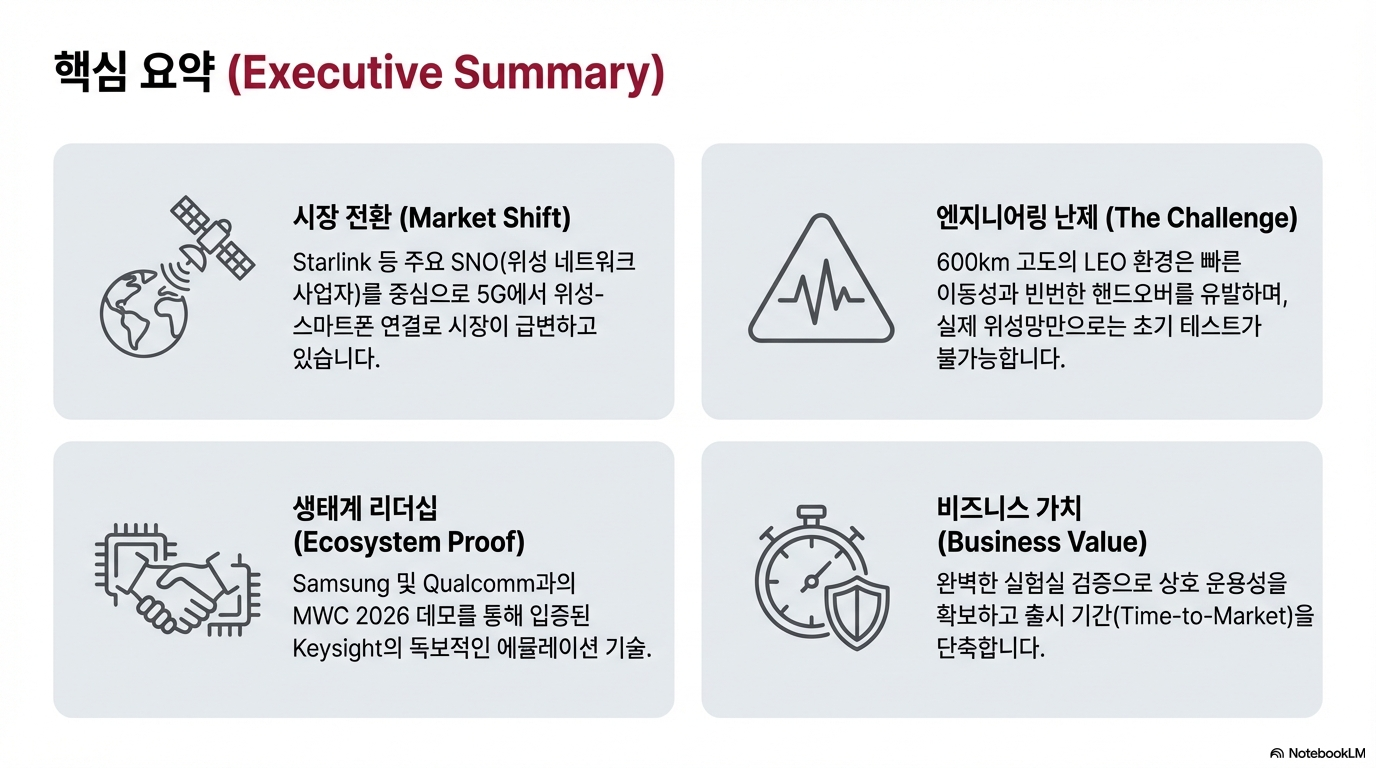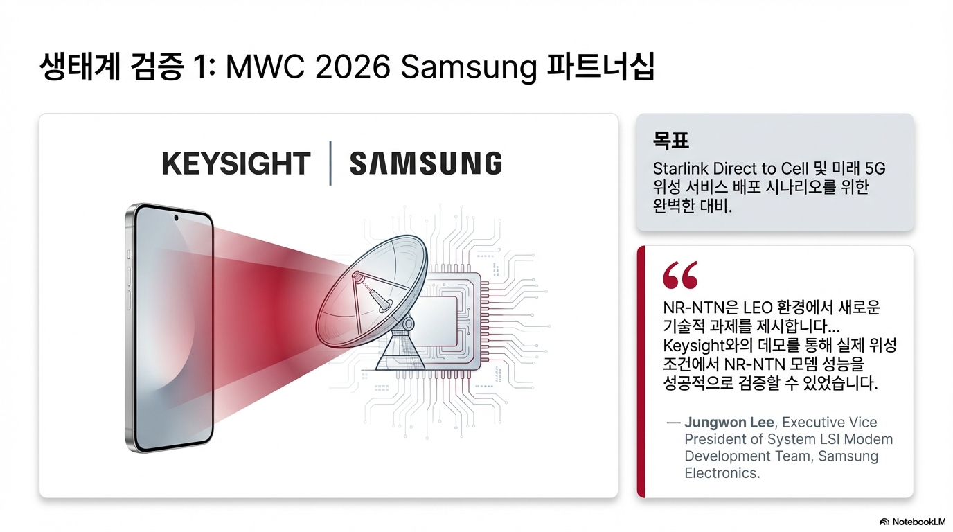 위성 통신이 우리 일상으로 들어오기 위한 가장 큰 난제는 빠른 속도로 이동하는 위성 간의 '핸드오버'와 신호 정렬입니다. 키사이트는 삼성전자, 스타링크(SpaceX)와 협력하여 MWC 2026에서 선보일 'NR-NTN LEO 이동성 테스트'를 준비하고 있습니다.