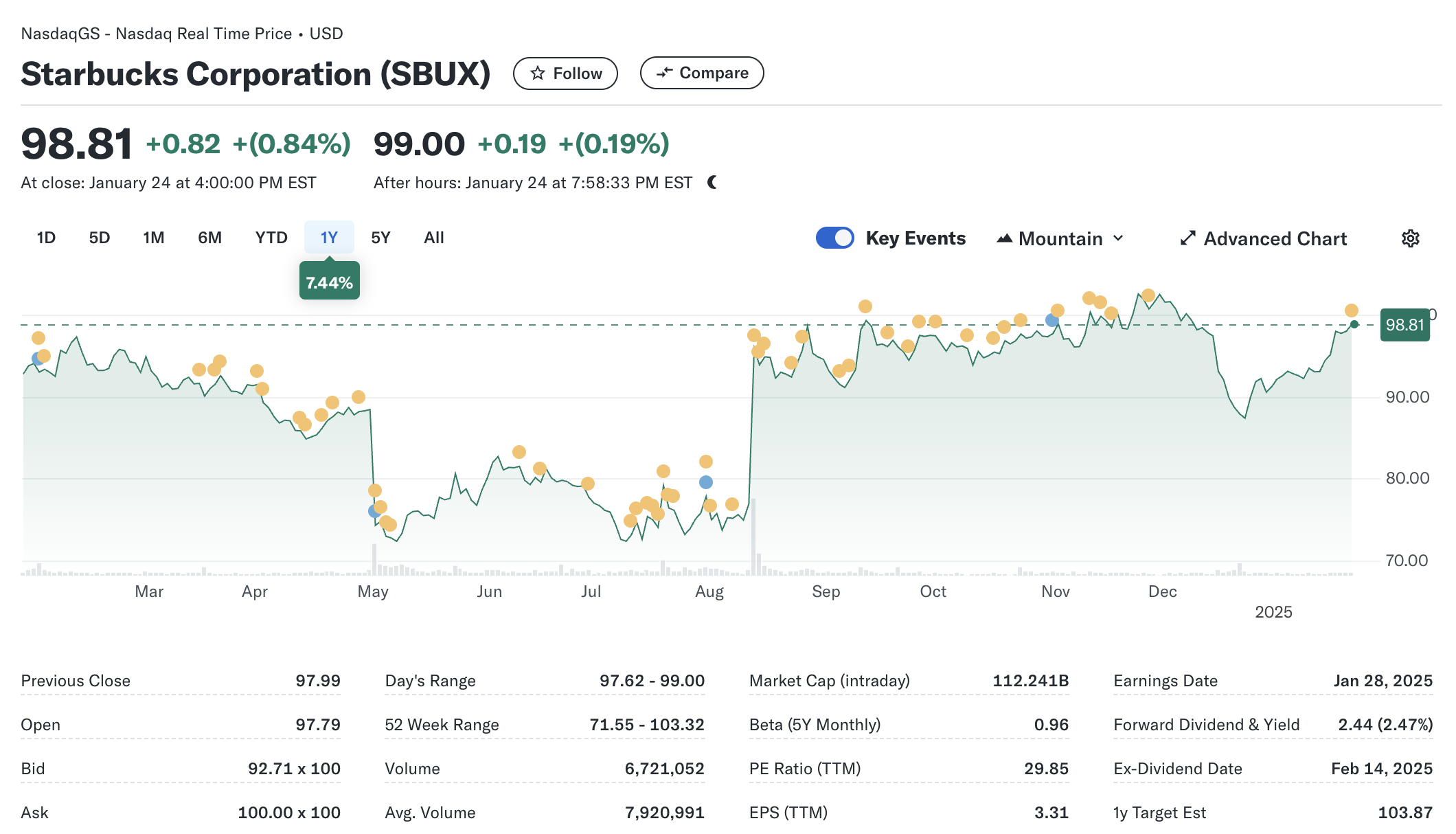 최근 스타벅스(SBUX)는 $98.81로 거래를 마감하며 전일 대비 0.84% 상승했습니다. 이는 S&P 500의 일일 손실(-0.29%)과 비교해 뛰어난 성과를 보여준 것입니다. 또한 다우 지수(-0.32%) 및 기술주 중심의 나스닥(-0.5%)과도 대조적인 모습입니다. 스타벅스의 주가는 최근 한 달 동안 6.67% 상승하며, 소매-도매(Retail-Wholesale) 부문의 평균 상승률 3.53%와 S&P 500의 2.52%를 모두 초과했습니다.