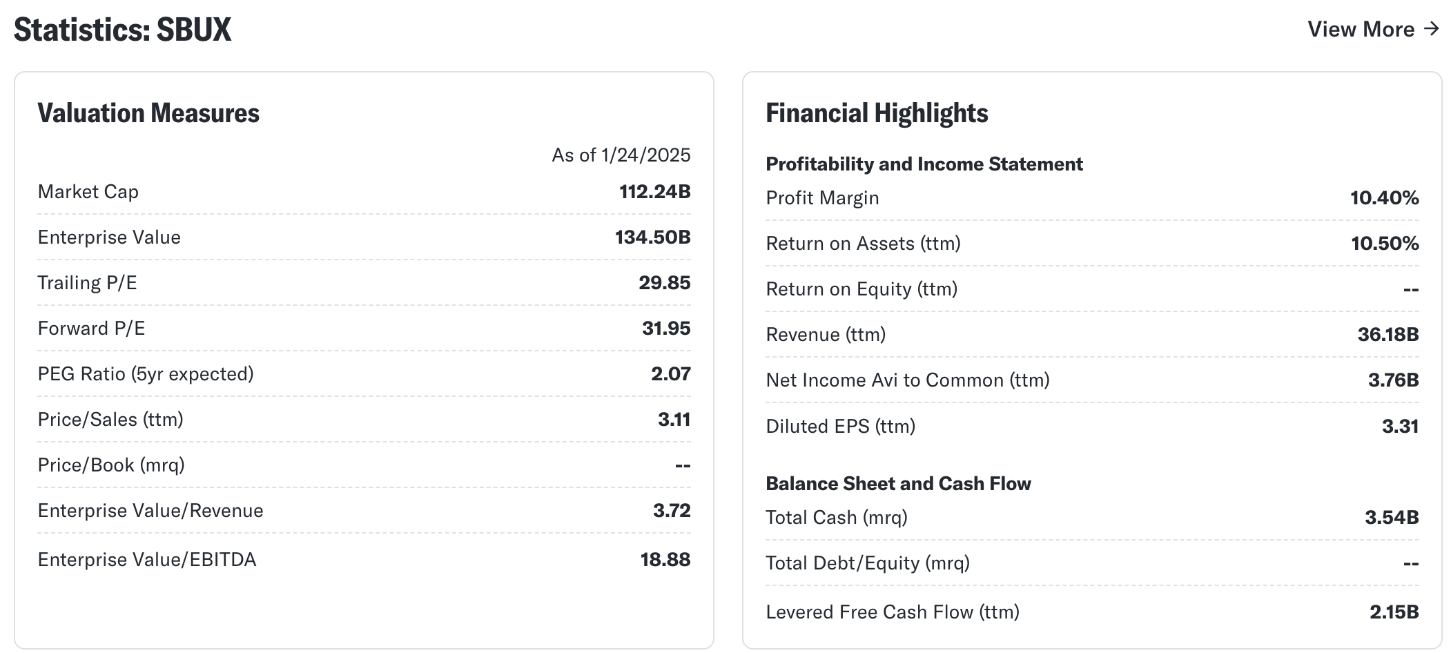 스타벅스의 현재 **Forward P/E(미래 주가수익비율)**는 31.79로, 이는 업계 평균 Forward P/E 23.62를 크게 상회합니다. Forward P/E는 주가가 향후 예상되는 수익과 비교하여 얼마나 고평가되었는지를 보여주는 지표로, 스타벅스는 업계 평균 대비 높은 프리미엄을 받고 있음을 나타냅니다. 이는 스타벅스가 강력한 브랜드 파워와 글로벌 시장 지배력을 보유하고 있다는 점에서 긍정적으로 평가될 수 있지만, 동시에 성장 잠재력에 비해 주가가 고평가되었다는 우려를 야기할 수 있습니다.