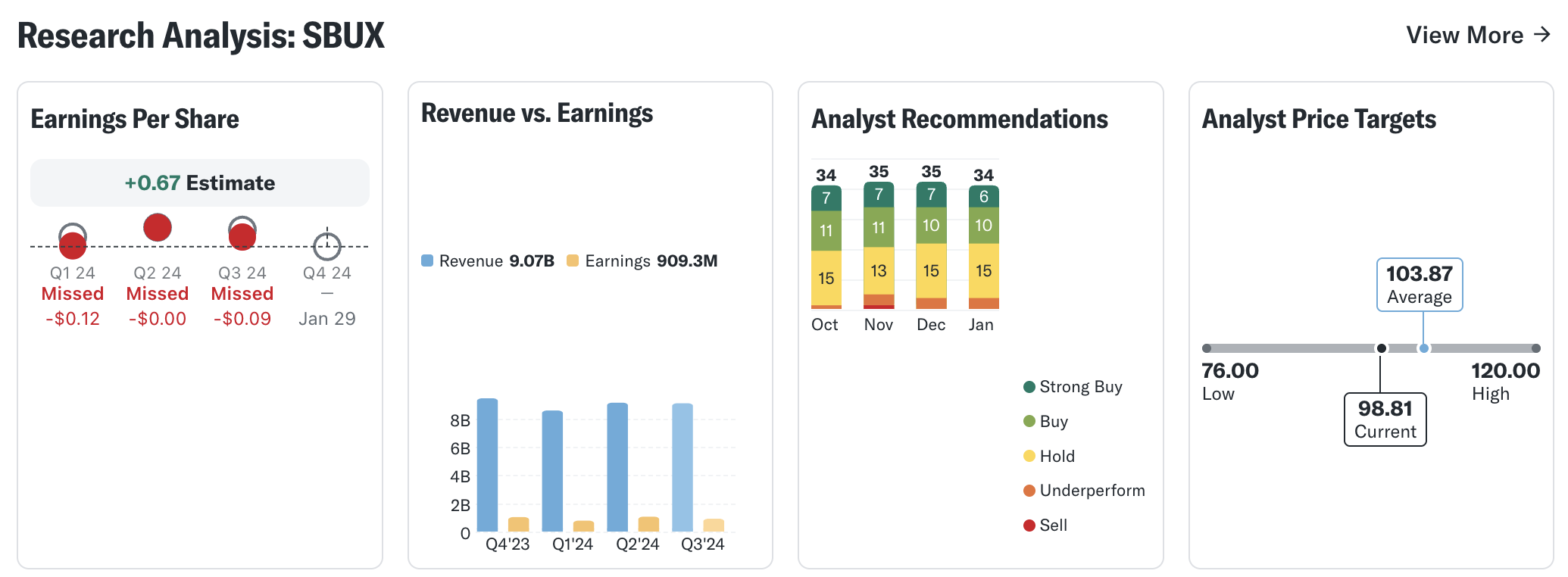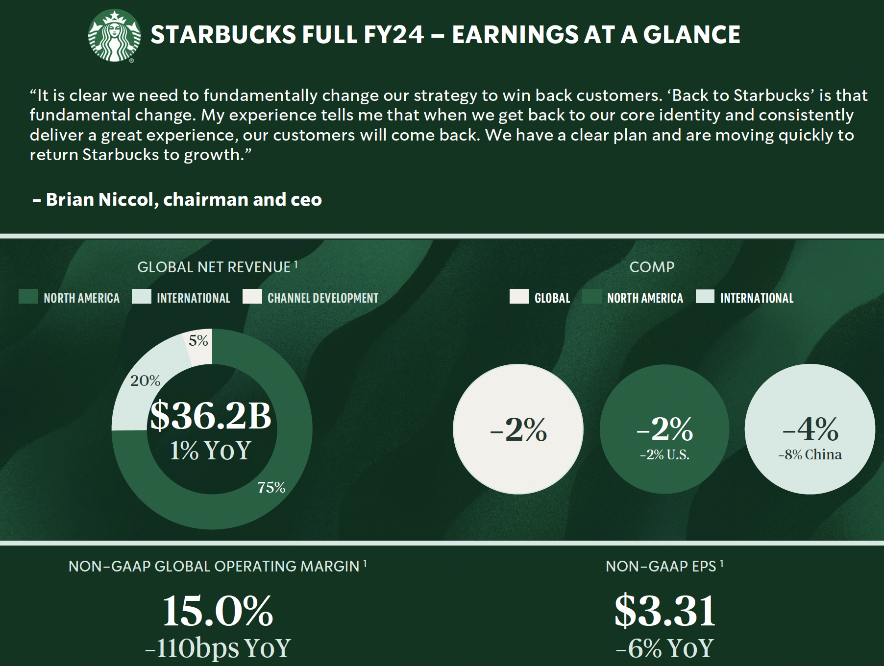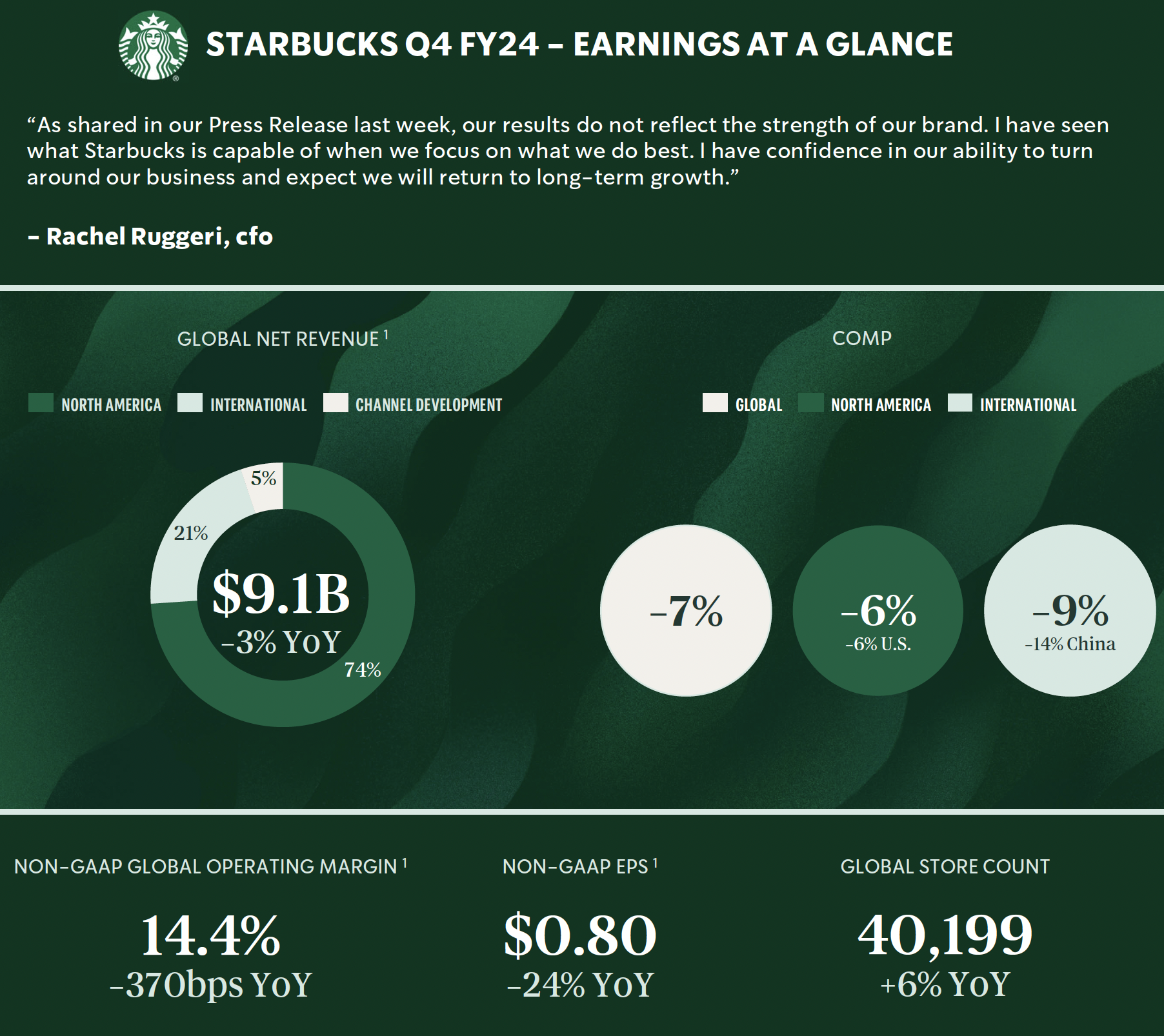지난 분기(2024 회계연도 4분기)에서 스타벅스는 EPS $0.80을 기록하며 Zacks 컨센서스 예상치와 일치했지만, 전년 동기 대비 24.5% 감소했습니다. 이와 같은 결과는 회사가 최근 몇 분기 동안 비용 증가와 시장 환경 변화에 직면하고 있음을 보여줍니다.