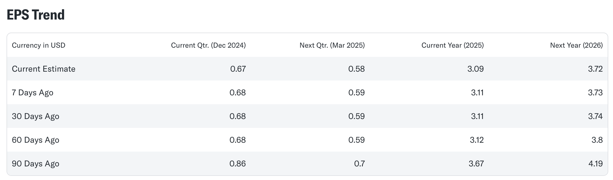 실적 발표가 임박함에 따라 애널리스트들은 스타벅스가 시장 기대치를 충족할 수 있을지 여부에 주목하고 있습니다. Zacks의 최근 자료에 따르면, 스타벅스의 EPS 컨센서스 예상치는 지난 7일 동안 $0.66에서 $0.65로 하향 조정되었습니다. 이는 시장이 현재 상황을 다소 보수적으로 평가하고 있음을 시사합니다.
