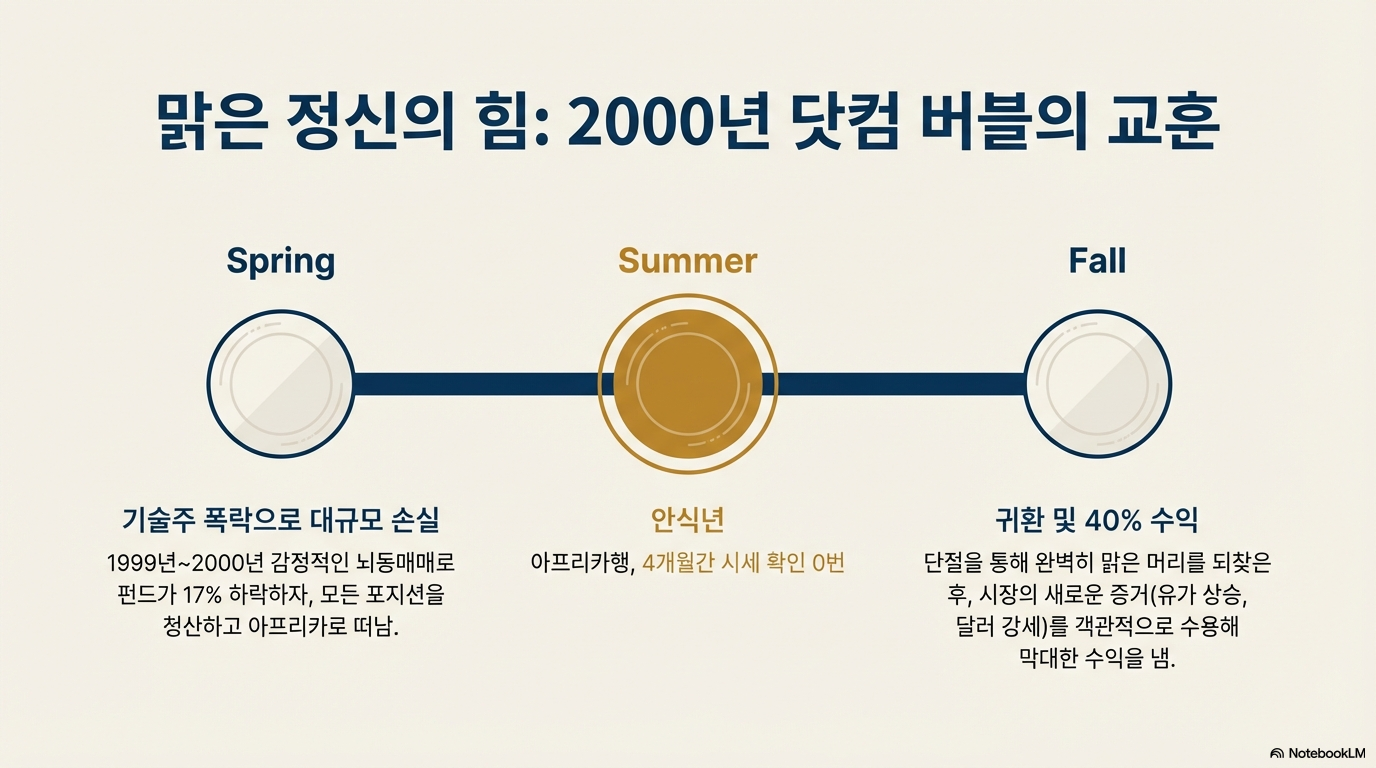 그는 "감정에 휘둘려 규율을 잃었다"는 사실을 깨닫고 즉시 은퇴를 선언하며 아프리카로 4개월간 안식년을 떠났습니다. TV도, 신문도 보지 않으며 뇌를 완전히 '리셋'했습니다. 그가 돌아왔을 때, 시장은 이전보다 훨씬 명확해 보였습니다. 달러, 금리, 유가가 동시에 상승하는 '죽음의 신호(Death knells)'를 포착한 그는 그해 4분기에만 40%의 수익을 올리며 모든 손실을 만회했습니다. 휴식은 단순한 쉼이 아니라, 객관성을 회복하기 위한 전략적 선택이었습니다.