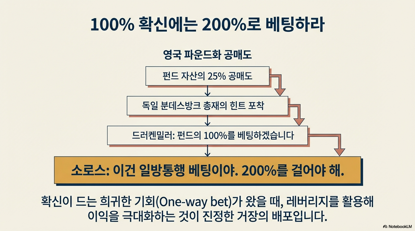 1992년 영국 파운드화 공매도 당시, 드러켄밀러는 펀드 자산의 100%를 거는 과감한 베팅을 준비했습니다. 하지만 소로스는 그를 비웃으며 "이것은 일생에 몇 번 오지 않는 '단방향 베팅(One-way bet)'이다. 100%가 아니라 200%를 걸어야 한다"고 다그쳤습니다. 당시 이 거래의 비용은 단 0.5%에 불과했지만 기대 수익은 막대했습니다. 즉, 컨벡시티(Convexity, 볼록성)가 극대화된 지점이었던 것입니다.