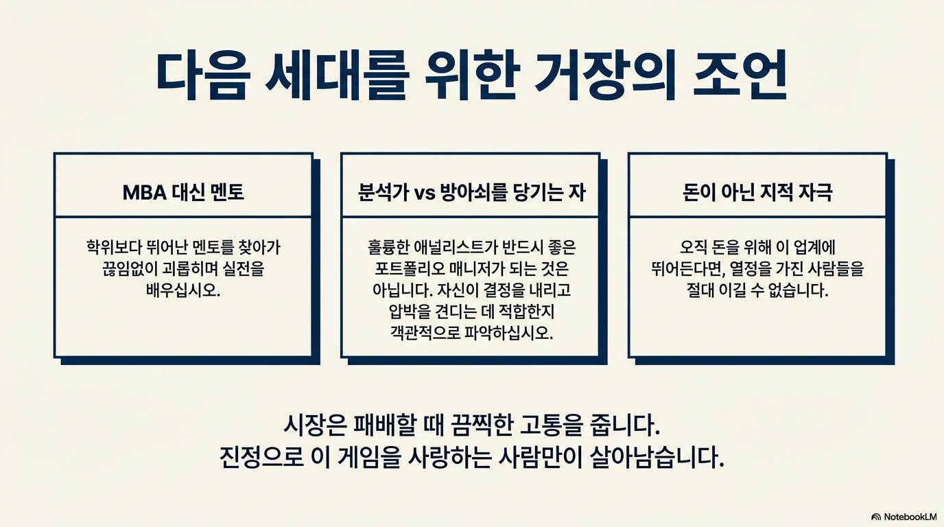스탠리 드러켄밀러는 젊은 투자자들에게 MBA를 따기보다 훌륭한 멘토를 찾으라고 조언합니다. 특히 그는 '분석가(Analyst)'와 '포트폴리오 매니저(PM)'의 역량은 완전히 다르다고 강조합니다. 훌륭한 분석 기술을 가졌더라도, 결정적인 순간에 '트리거(Trigger)'를 당길 수 있는 실행력이 없다면 투자자로서는 성공하기 어렵다는 뜻입니다.