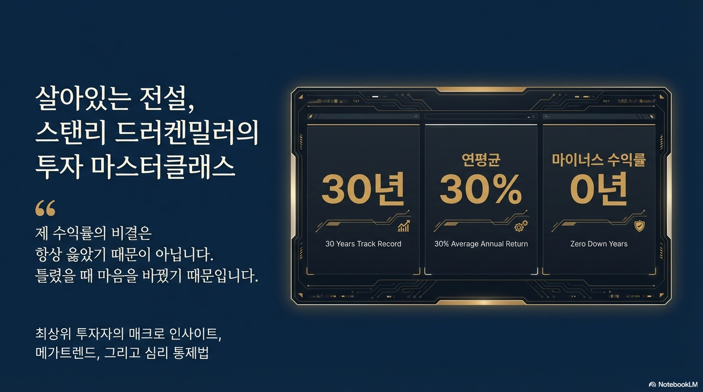 여기, 그 투자의 미로에서 길을 잃은 이들에게 등불이 되어줄 ‘살아있는 전설’이 있습니다. 바로 스탠리 드러켄밀러(Stanley Druckenmiller)입니다. 그는 조지 소로스의 퀀텀 펀드를 이끌며 영국 영란은행을 굴복시킨 주역이자, 30년 동안 단 한 번의 마이너스 수익률 없이 연평균 30%라는 경이로운 기록을 달성한 인물입니다. 최근 노르웨이 국부펀드 CEO 니콜라이 탕겐과의 인터뷰를 통해 공개된 그의 통찰은 우리가 '정석'이라 믿었던 투자 원칙들을 정면으로 뒤집습니다. 단순히 정보를 나열하는 것을 넘어, 자본 시장이라는 정글에서 압도적인 승자가 되기 위한 그의 5가지 역설적 철학을 분석합니다.