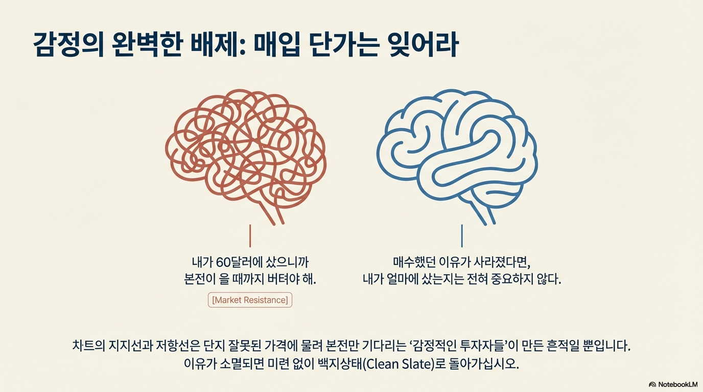 성공적인 투자자는 자신의 가설이 틀렸음을 깨닫는 순간 깨끗하게 판을 닦고(Clean the slate) 다시 시작할 수 있어야 합니다. 그는 "아무리 분석을 깊게 했더라도, 시장이 내가 생각한 이유와 다르게 움직이면 감정 없이 포지션을 정리한다"고 말합니다. 유연함과 겸손함이야말로 비대칭적 위험-보상(Asymmetric risk-reward)을 찾는 가장 강력한 무기입니다.