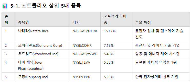 - 헬스케어 비중 급증: 1위 나테라(Natera)와 4위 테바(Teva)의 비중이 포트폴리오의 20% 이상을 차지하며 헬스케어 산업에 대한 신뢰를 보여줍니다.