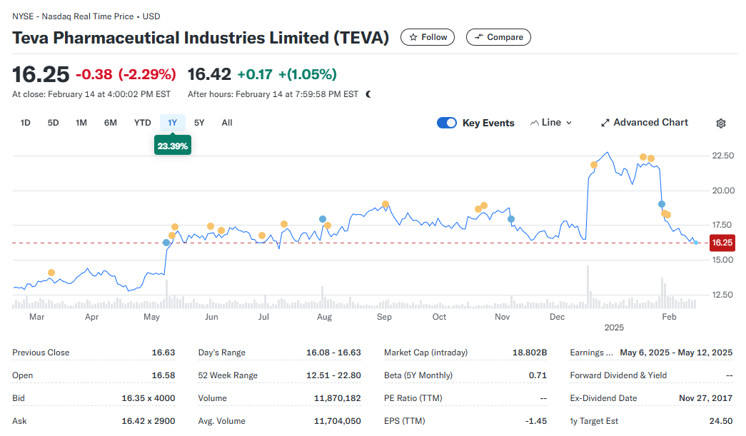 - 테바 제약(Teva Pharmaceutical Industries Ltd, NYSE:TEVA) - 5.33%