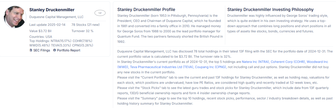 드러켄밀러는 1981년 **두케인 캐피탈 매니지먼트(Duquesne Capital Management)**를 설립한 이후 2010년부터 이를 패밀리 오피스로 전환하여, 자신의 자산을 기반으로 독립적인 투자 활동을 이어가고 있습니다. 그의 투자 전략은 **거시 경제 변화에 따른 산업군 선택(Top-Down Approach)**을 기반으로, 시장의 흐름에 따라 공격적이면서도 유연하게 포트폴리오를 재조정하는 특징을 가집니다.