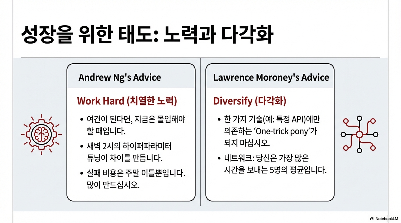 이 글은 최근 스탠퍼드 대학교에서 진행된 앤드류 응(Andrew Ng)과 로렌스 모로니(Lawrence Moroni)의 AI 커리어 강연에서 가장 중요하고, 때로는 직관에 반하는 핵심 인사이트를 분석하고 정리하기 위해 작성되었습니다. 넘쳐나는 정보의 홍수 속에서 길을 잃지 않고, 실제로 여러분의 경력에 도움이 될 명확하고 실행 가능한 조언들을 소개하고자 합니다.