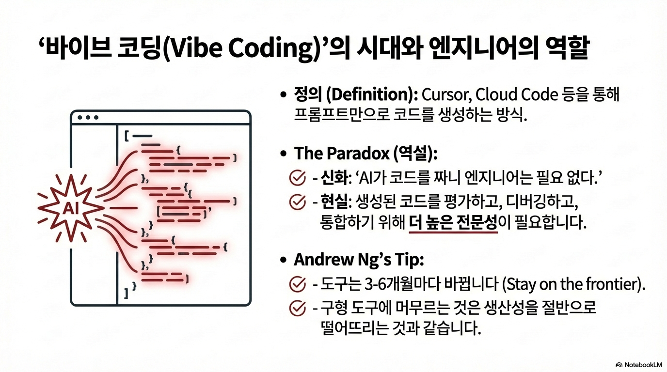 "명확하게 작성된 소프트웨어 사양에서 코드를 얻는 것이 갈수록 쉬워지면서, 병목 현상은 점점 '무엇을 만들지' 결정하거나, 실제로 원하는 바를 명확한 사양으로 작성하는 데서 발생하게 됩니다." - 앤드류 응 (Andrew Ng)