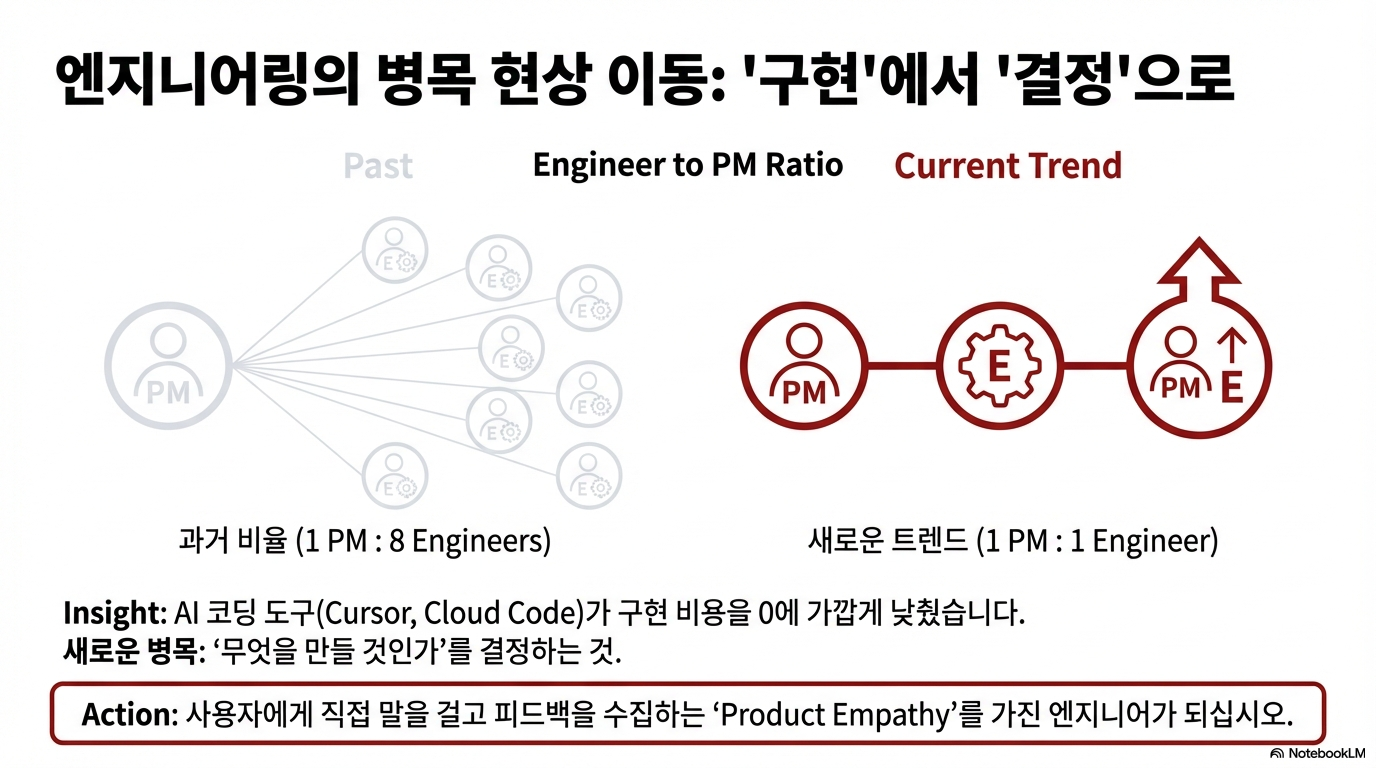 전통적으로 소프트웨어 개발의 병목은 엔지니어링, 즉 '어떻게 만들 것인가'에 있었습니다. 하지만 이제는 코드를 작성하는 과정 자체가 훨씬 저렴하고 빨라지면서, 병목 현상은 '무엇을 만들 것인가'를 결정하고 명확한 사양을 작성하는 제품 관리(PM) 단계로 옮겨가고 있습니다.