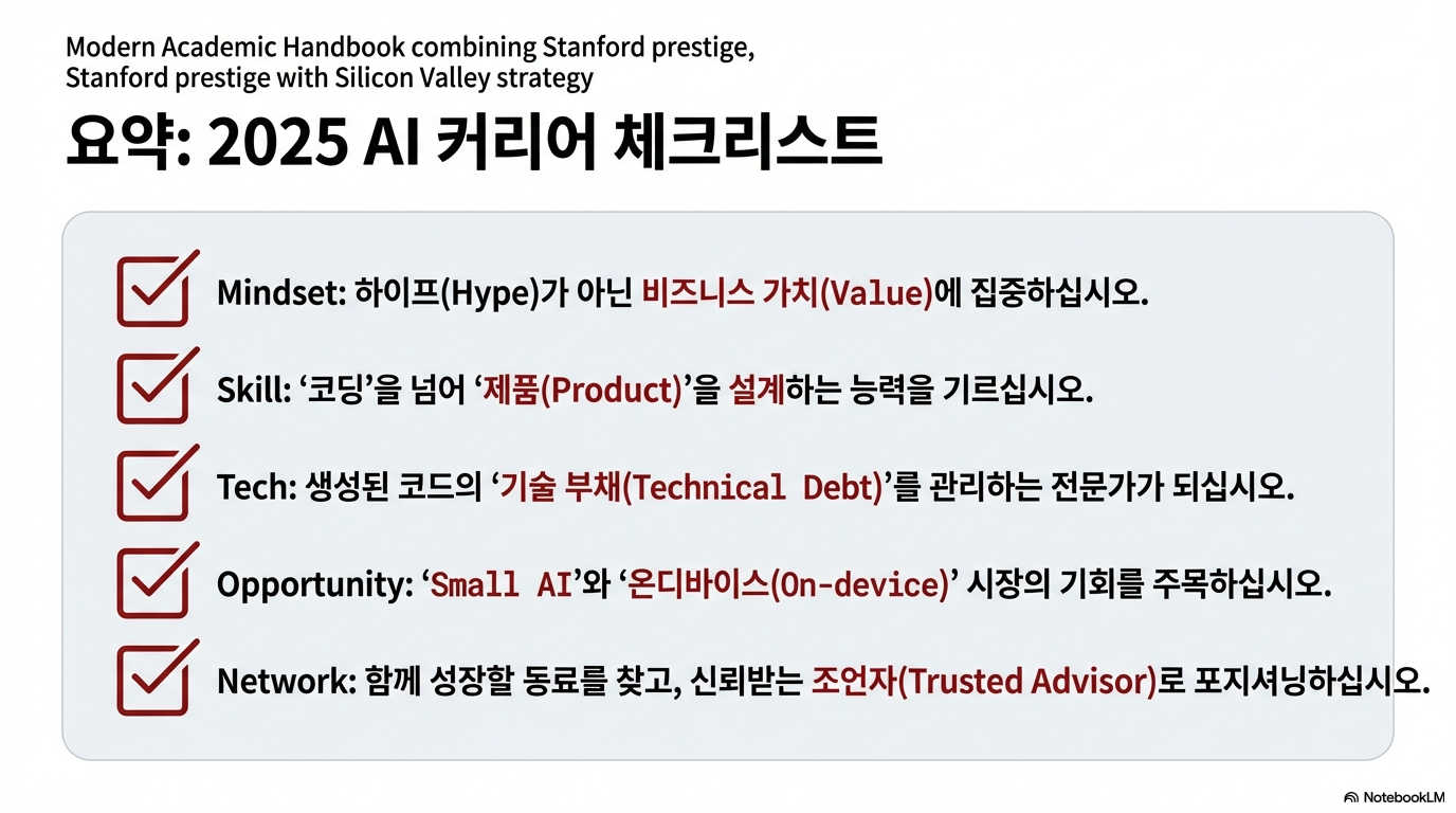 스탠퍼드 강연이 관통하는 핵심 메시지는 명확합니다. 앤드류 응과 로렌스 모로니 모두 '일단 만들어보라(just go and build stuff)'는 실행의 중요성을 거듭 강조했습니다. AI 시대의 성공은 (점점 더 쉬워지고 있는) 순수한 기술 실행 능력보다는 전략적 사고, 협업 능력, 그리고 비즈니스에 대한 깊은 이해에 달려 있다는 것입니다.