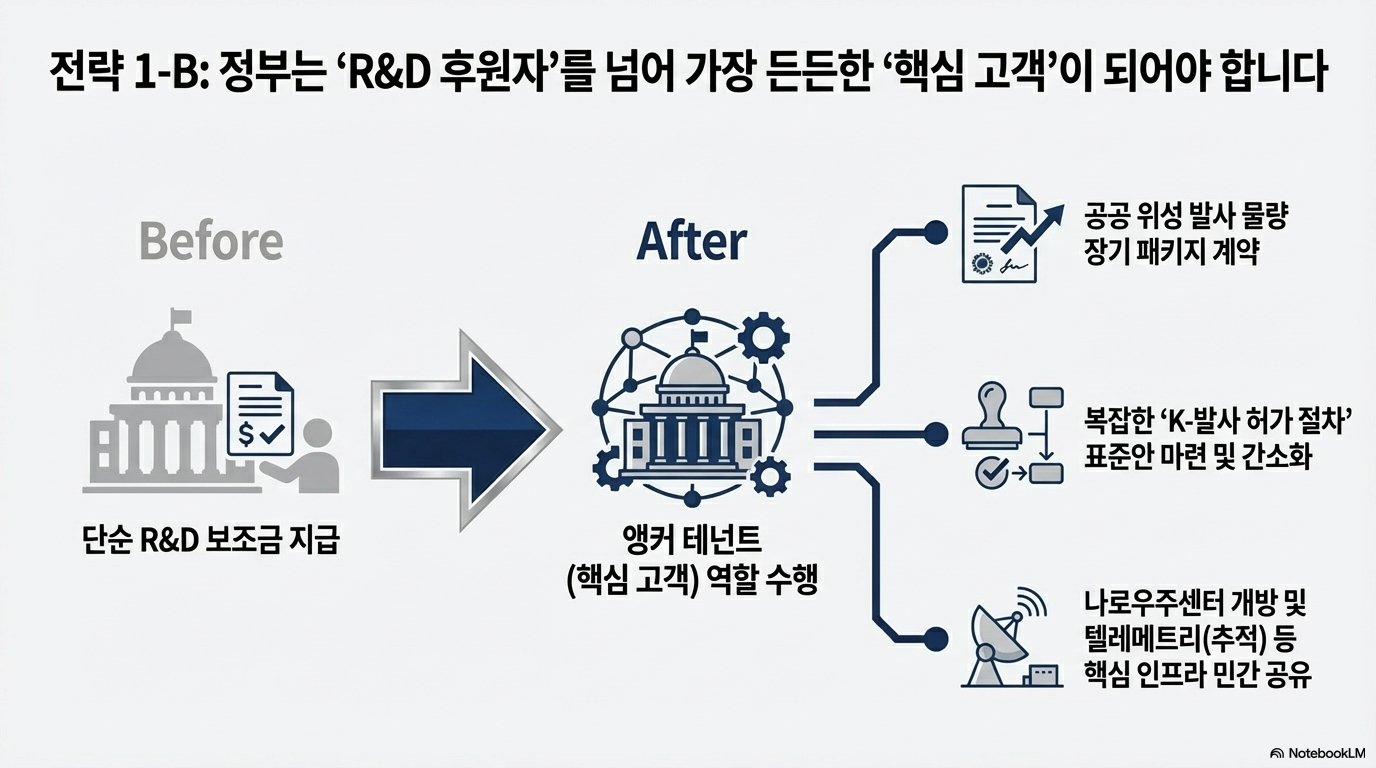 이제 정부의 역할은 단순한 R&D 지원금 지급이라는 관성에서 벗어나야 합니다. 과거 NASA가 민간 로켓 서비스를 적극적으로 구매하며 스페이스X를 키워냈듯, 우리 정부도 민간 서비스의 '앵커 테넌트(Anchor Tenant, 핵심 고객)'가 되어야 합니다.