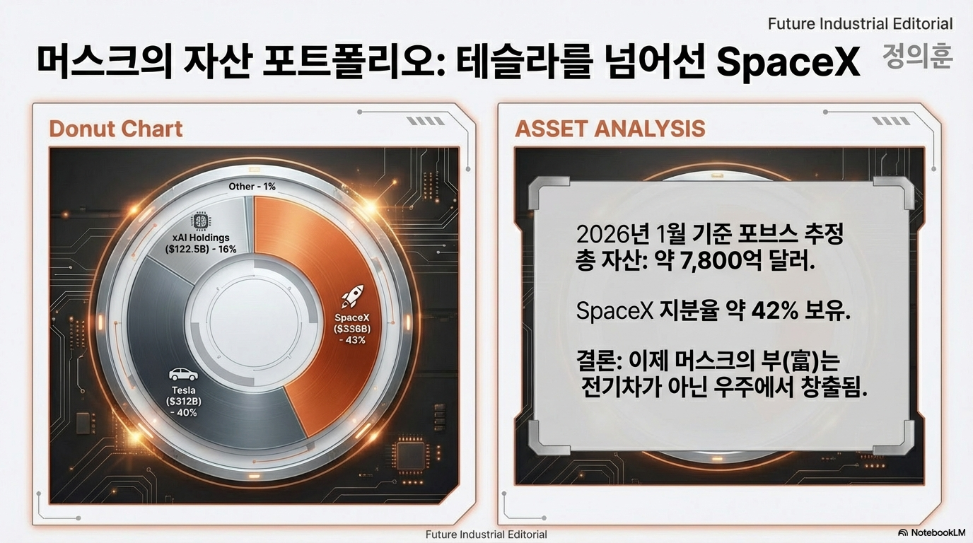 그의 자산 포트폴리오에서 가장 큰 비중을 차지하는 것은 바로 스페이스X 지분입니다. 그는 회사 지분의 약 42%를 보유하고 있으며, 그 가치는 현재 약 3,360억 달러로 평가됩니다. 만약 스페이스X가 1.5조 달러의 가치로 성공적으로 상장한다면, 그의 지분 가치 역시 폭발적으로 상승해 개인 자산 1조 달러의 문턱을 넘어서게 될 것입니다.