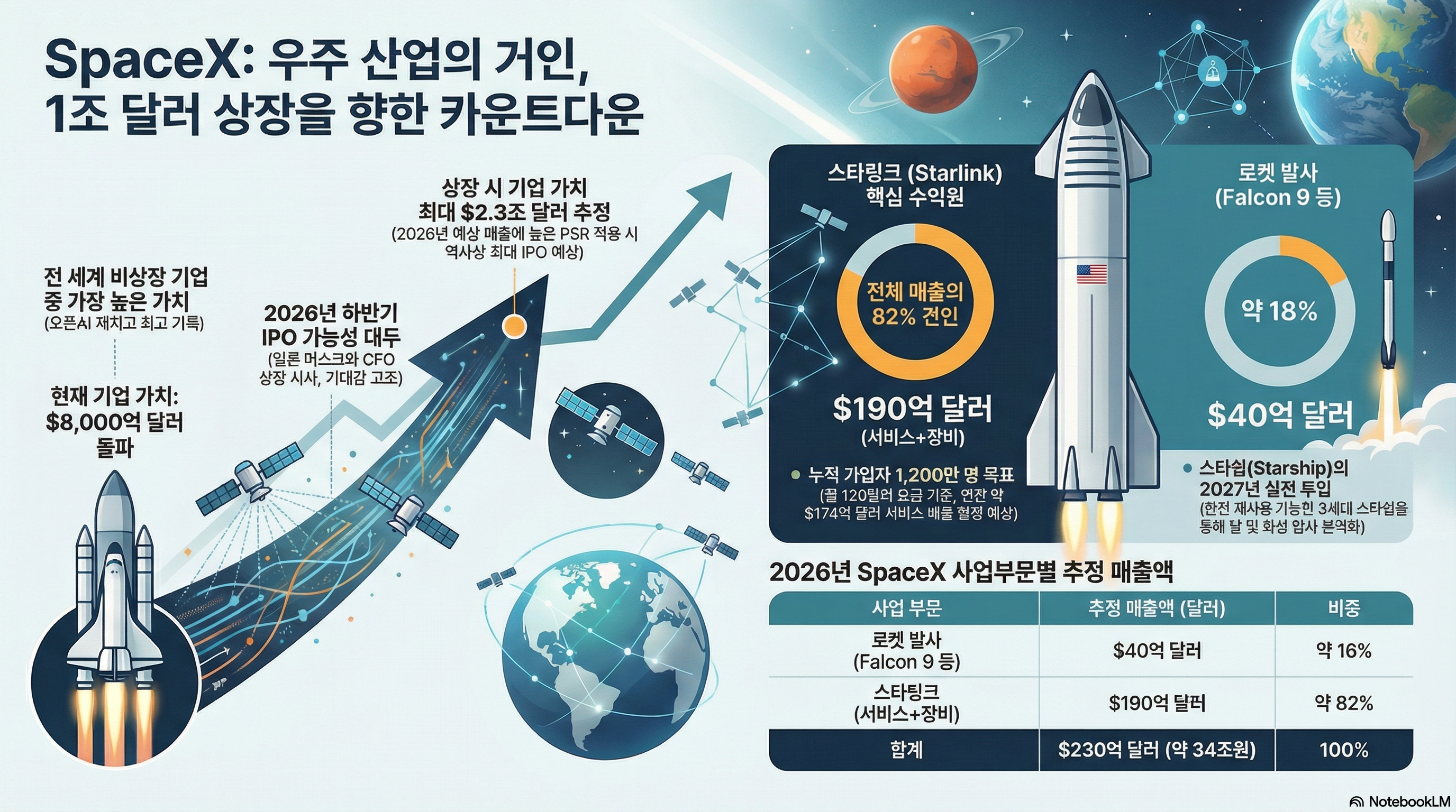 우리는 스페이스X를 '팰컨 9' 로켓을 쏘아 올리는 '로켓 회사'로 인식하는 경향이 있습니다. 그러나 기업의 가치를 결정하는 핵심 동력은 다른 곳에 있습니다. 2026년 스페이스X의 예상 연간 매출 추정치를 살펴보면, 로켓 사업 부문이 40억 달러를 벌어들일 때 위성 인터넷 서비스인 스타링크(Starlink) 사업 부문은 무려 190억 달러의 매출을 기록할 것으로 전망됩니다.