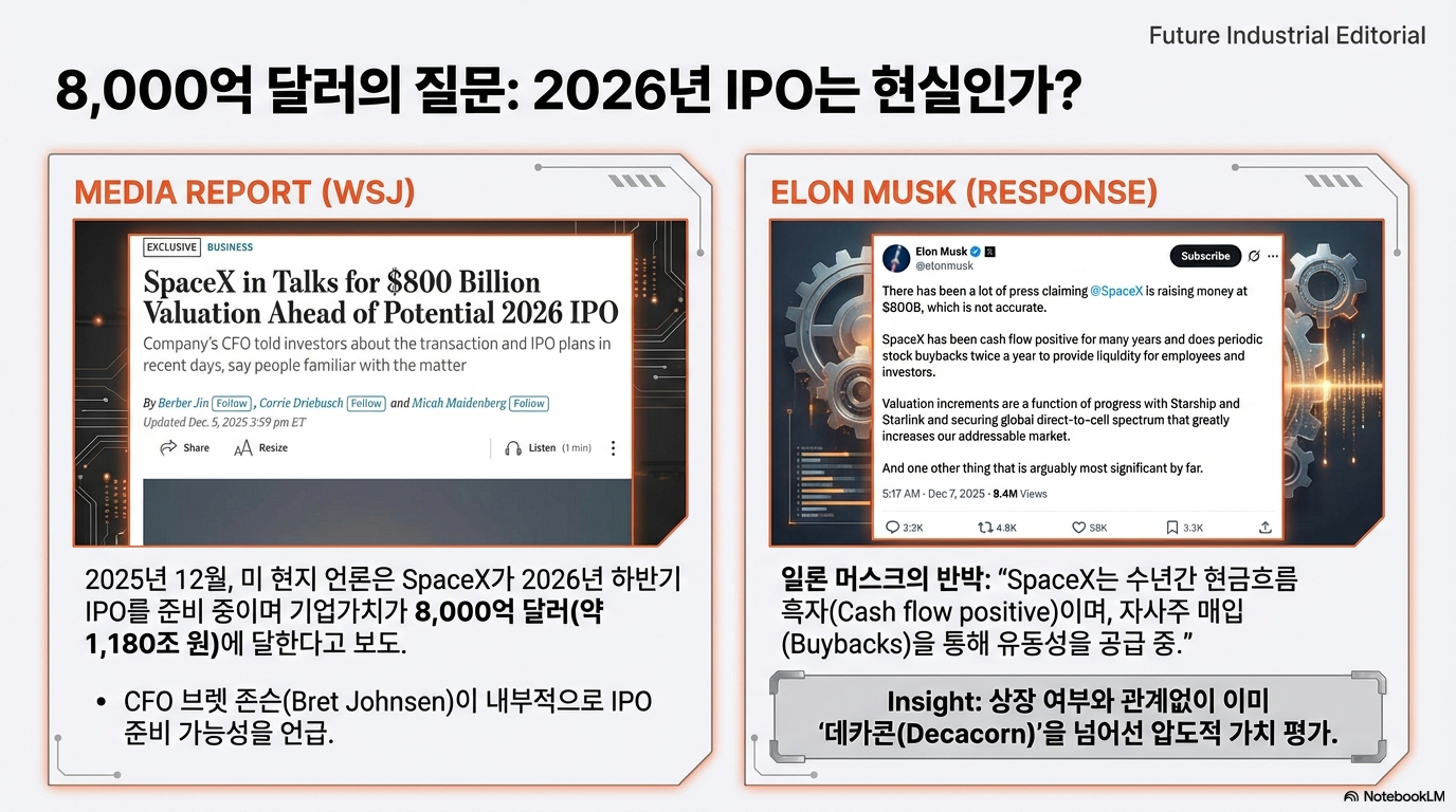 스페이스X는 아직 상장되지 않았음에도 불구하고 이미 천문학적인 기업 가치를 인정받고 있습니다. 2025년 12월, 비상장 주식 거래에서 스페이스X는 약 8,000억 달러(약 1,180조 원)의 기업 가치를 평가받았습니다. 이는 최근 가장 주목받는 AI 기업인 오픈AI(OpenAI)의 가치를 뛰어넘는 금액입니다. 비록 일론 머스크가 당시의 8,000억 달러 펀딩 소문은 정확하지 않다고 선을 그었지만, 이는 시장이 스페이스X의 가치를 얼마나 높게 평가하고 있는지를 보여주는 상징적인 사건이었습니다.