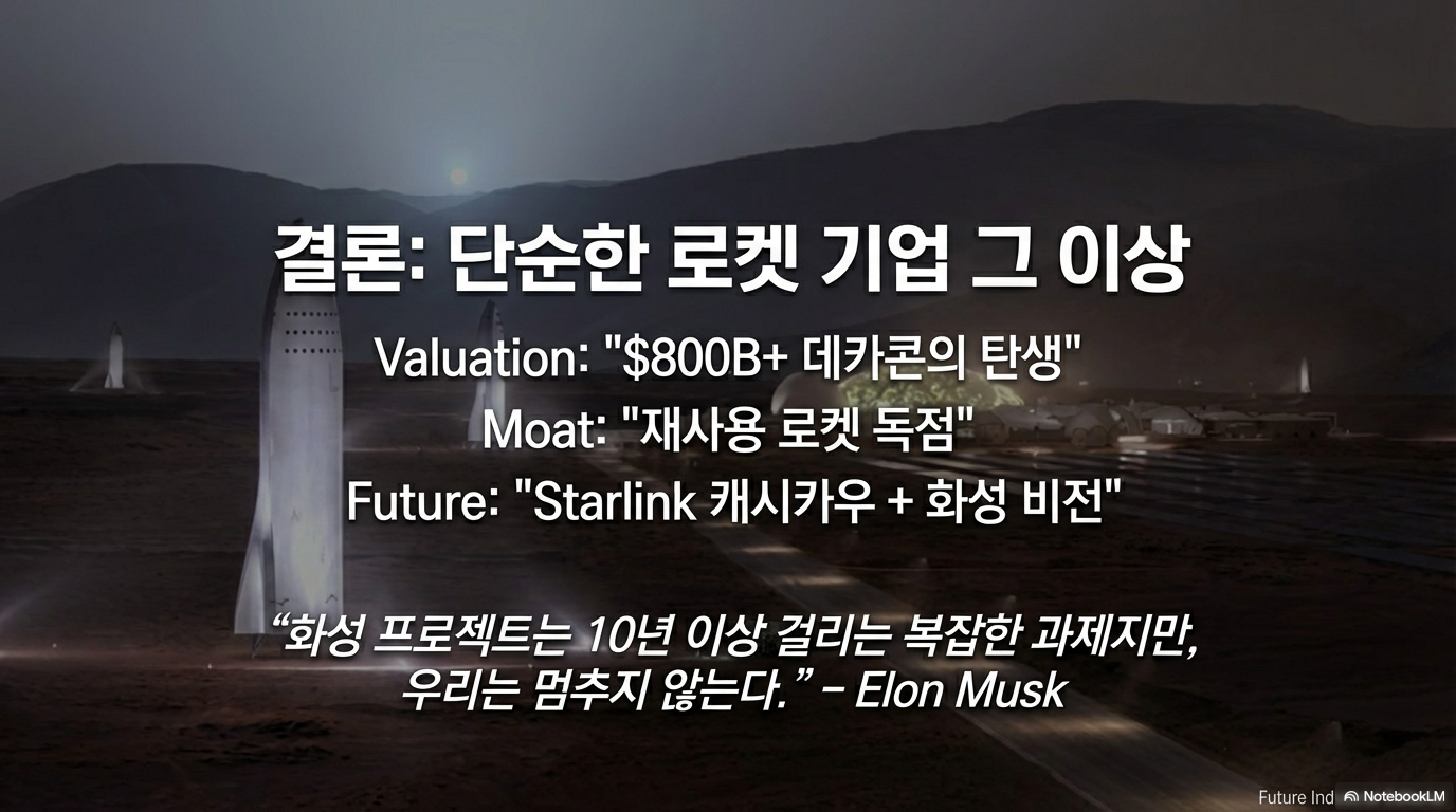 지금까지 살펴본 5가지 사실은 스페이스X가 단순한 로켓 회사를 넘어선 글로벌 위성 통신 기업이며, 창업자의 오랜 신념마저 바꿀 만큼 사업이 성숙했고, 그 가치는 역사를 새로 쓸 만큼 거대하며, 이 모든 성취가 '재사용'이라는 기술 혁신에 뿌리를 두고 있음을 보여줍니다.