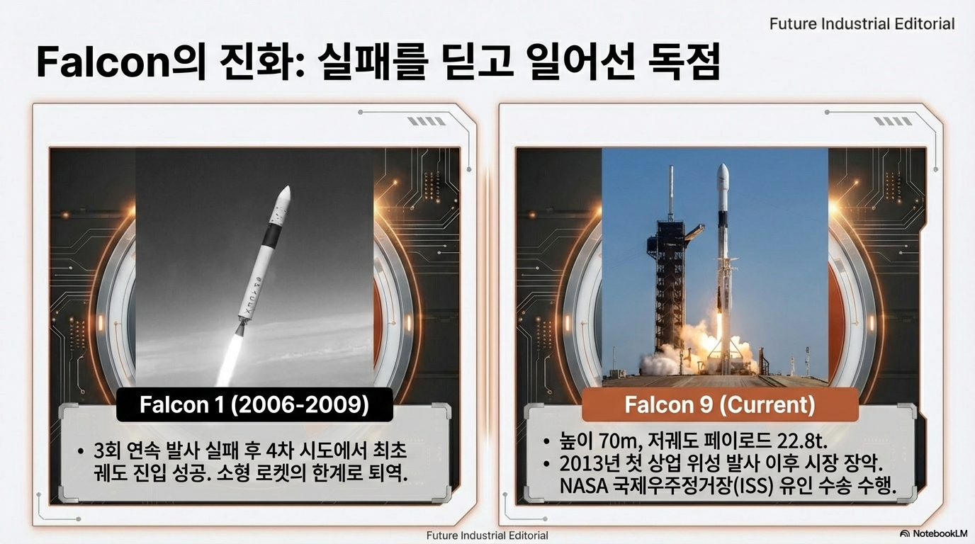 스페이스X의 경이로운 성장은 하나의 기술적 혁신, 바로 '로켓 재사용'에서 비롯되었습니다. 2015년 팰컨 9(Falcon 9) 로켓의 1단 추진체를 성공적으로 회수한 이래, 2017년에는 세계 최초로 회수한 로켓을 재발사하는 데 성공하며 우주 산업의 패러다임을 완전히 바꾸었습니다.