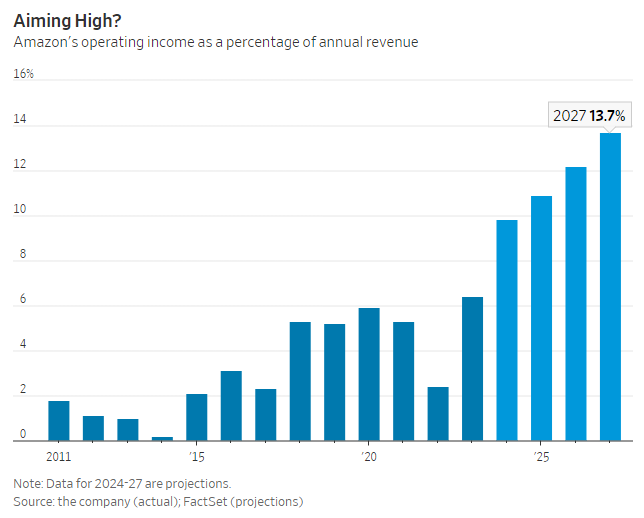 아마존은 전 세계에서 가장 영향력 있는 기술 기업 중 하나로, 클라우드 컴퓨팅, 전자상거래, 광고 등 다양한 사업 영역에서 두각을 나타내고 있습니다. 이러한 사업들은 아마존이 전통적으로 유지해 온 얇은 이익률을 극복하는 데 중요한 역할을 해왔으며, 실제로 최근 몇 년간 회사의 전체 영업이익률이 크게 개선되었습니다. 2010년부터 2019년까지 평균 2.6%의 영업이익률을 기록했던 아마존은 2023년까지 이를 9%로 끌어올리며 수익성을 대폭 강화했습니다. 이에 따라 월스트리트는 아마존이 앞으로도 강력한 수익 성장세를 유지할 것이라는 기대를 품고 있습니다.