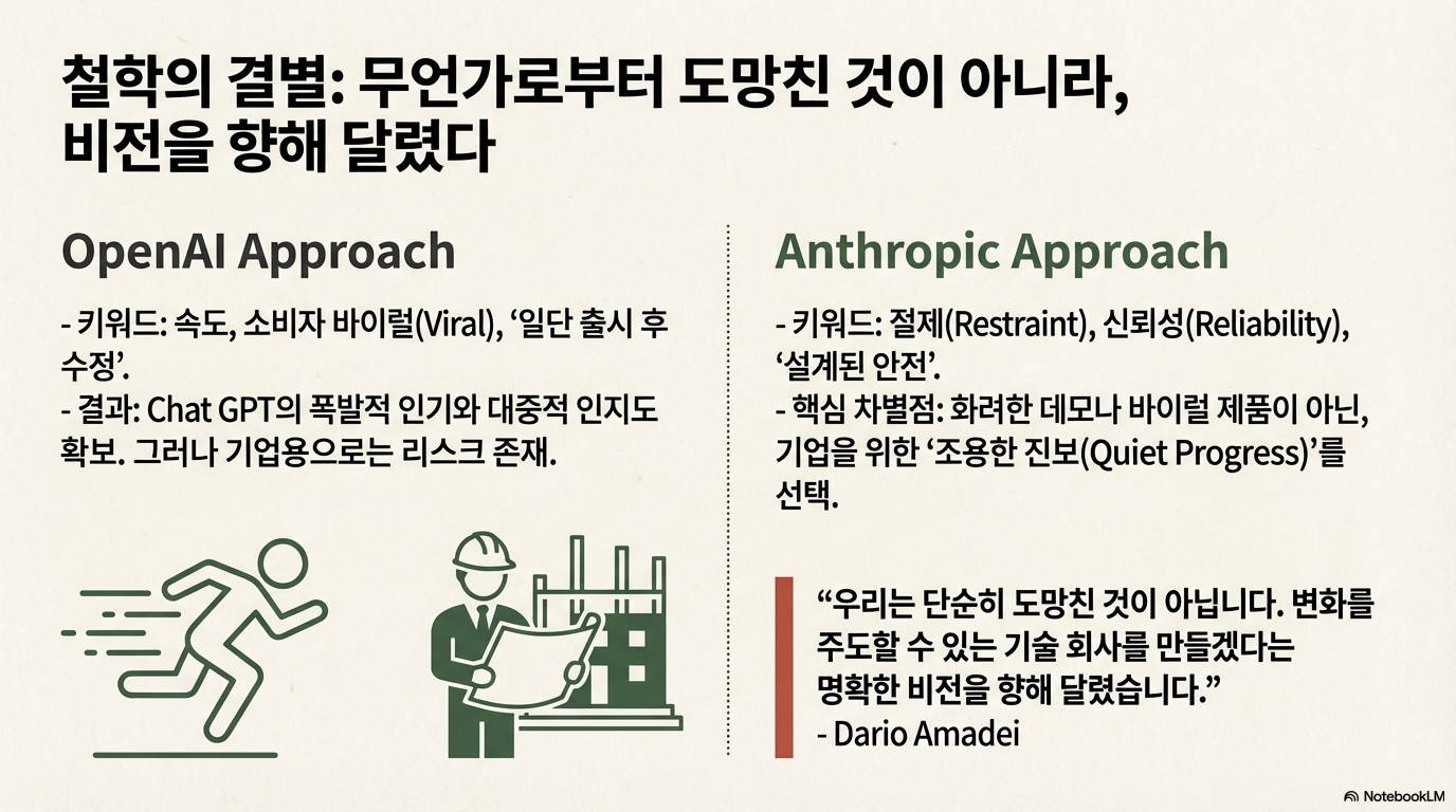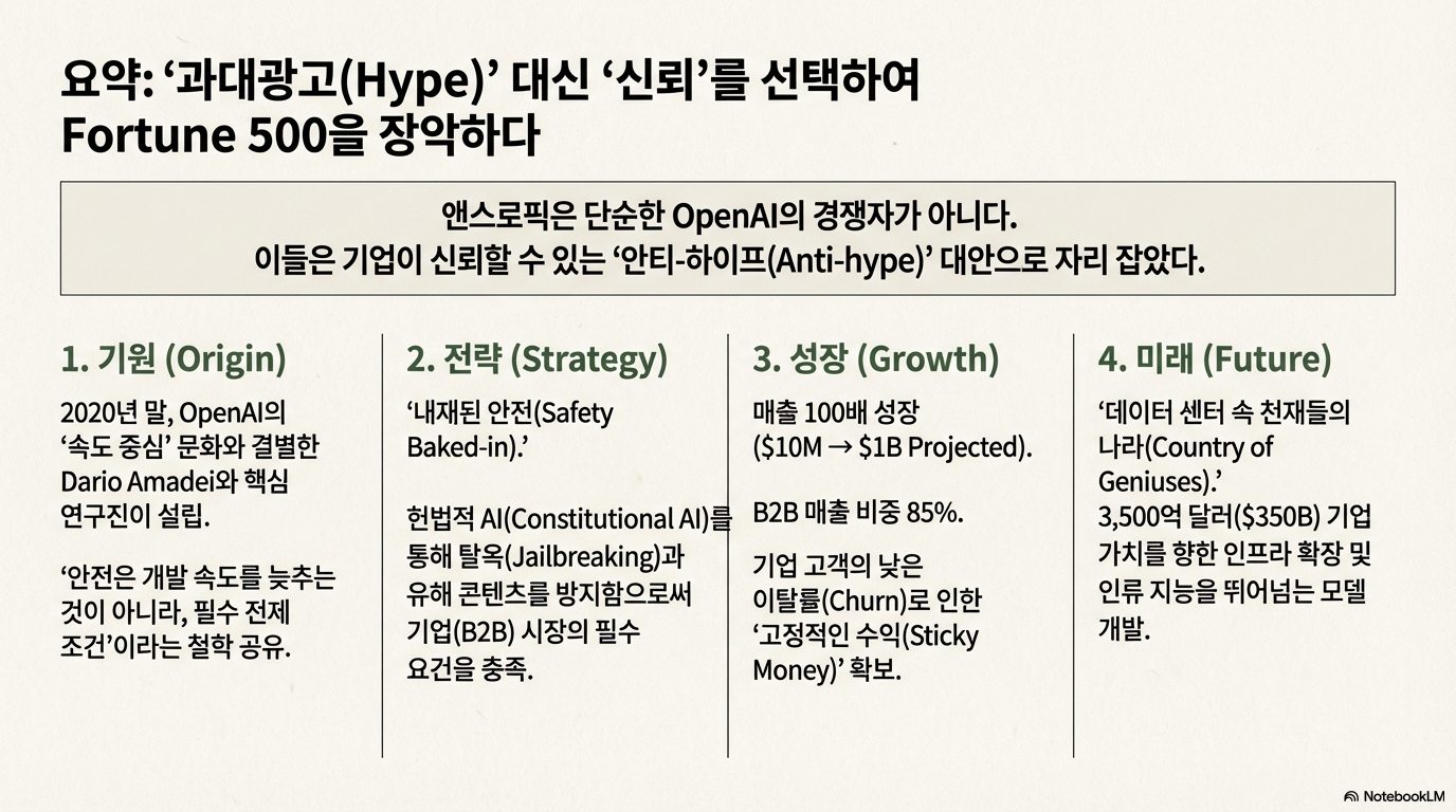 앤트로픽의 성공은 단순히 더 나은 모델을 만드는 경쟁을 넘어섭니다. 그들의 부상은 '안전 우선주의', '기업 시장 집중', '급진적 투명성'이라는 독특한 전략적 선택이 가장 치열한 기술 전쟁터에서도 통할 수 있음을 증명하고 있습니다.