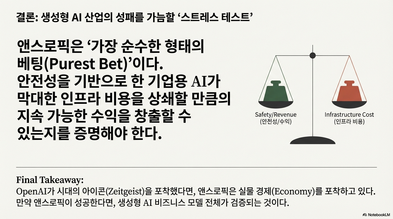 이 때문에 업계에서는 앤트로픽을 'AI 산업 전체의 성공을 가늠할 수 있는 가장 순수한 바로미터'로 여깁니다. 진짜 시험대는 이것입니다. 앤트로픽이 폭증하는 수요를 "천문학적인 인프라 비용을 감당하며 지속 가능한 수익으로" 전환할 수 있다면, 이는 앤트로픽의 승리를 넘어 생성형 AI라는 비즈니스 모델 자체를 입증하는 사건이 될 것입니다.