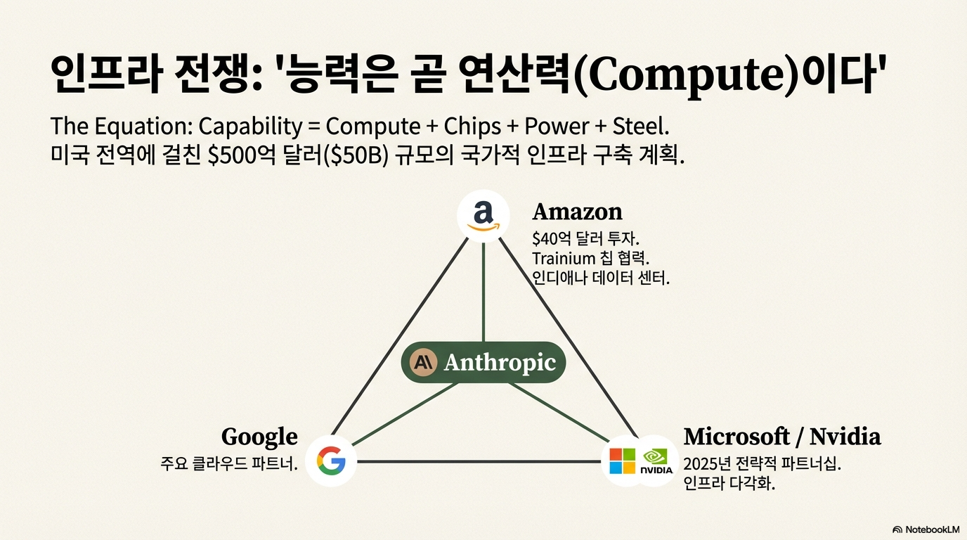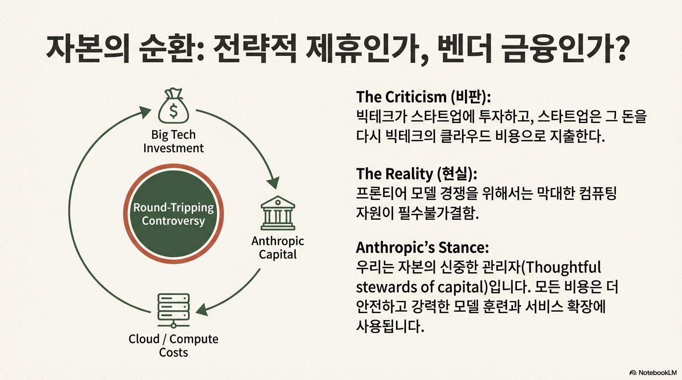 앤트로픽의 자금 조달 방식은 이 현실을 명확하게 보여줍니다. 그들은 아마존, 구글, 마이크로소프트로부터 수십억 달러를 투자받고, 그 돈을 다시 투자사들의 클라우드 컴퓨팅 자원을 구매하는 데 사용합니다. 약 1,000억 달러에 달하는 컴퓨팅 약정을 확보한 이 기묘한 순환 구조를 비평가들은 "전략적 파트너십으로 위장한 공급업체 금융(vendor financing dressed up as strategic partnership)"이라고 부릅니다. 이는 앤트로픽과 같은 선두 AI 기업의 경쟁력이 어떻게 거대 인프라 제공업체와 불가분하게 얽혀 있는지를 보여주는 단적인 예시입니다.