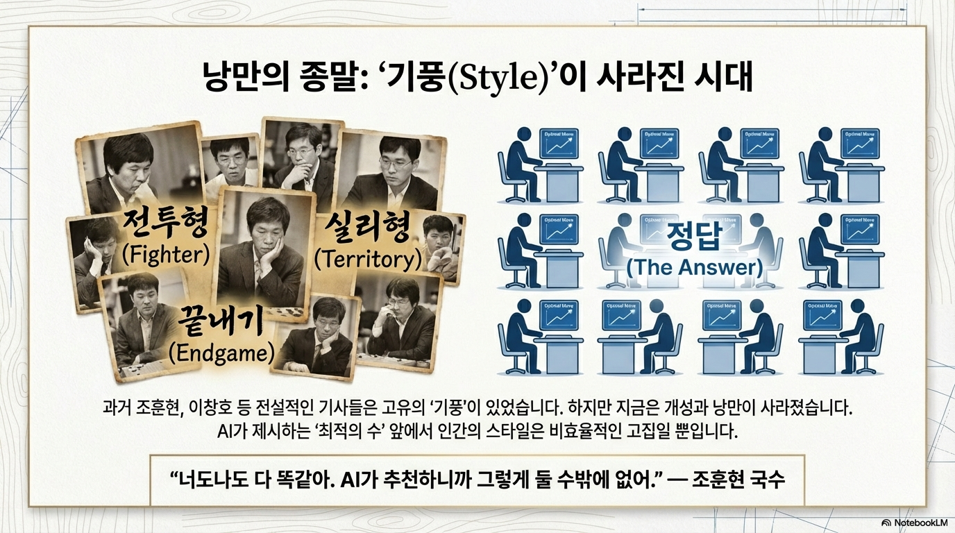 하지만 AI의 등장은 이 모든 것을 바꿔놓았다. AI가 모든 상황에 대한 '정답'에 가까운 수를 제시하자, 승리를 위해 모든 기사들이 AI의 추천 수를 따라 두기 시작했다. AI라는 절대적인 심판 앞에서, 한때 바둑판을 수놓았던 거장들의 독창적인 서명, 즉 기풍은 그 의미를 잃고 회색빛 균일함 속으로 녹아내렸다. 바둑의 황제 조훈현 국수는 이 변화가 주는 상실감을 이렇게 표현했다.