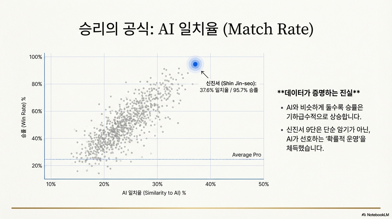 한 연구 결과는 이를 냉정한 수치로 증명한다. 신진서 9단의 AI 일치율은 37.6%에 달하며, 이는 95.7%라는 경이로운 승률로 이어졌다. 반면, 연구 대상 중 가장 낮은 일치율을 보인 기사는 22.6%의 일치율과 27.3%의 승률에 그쳤다. AI의 논리를 얼마나 깊이 이해하느냐가 승패를 가르는 절대적인 척도가 된 것이다.