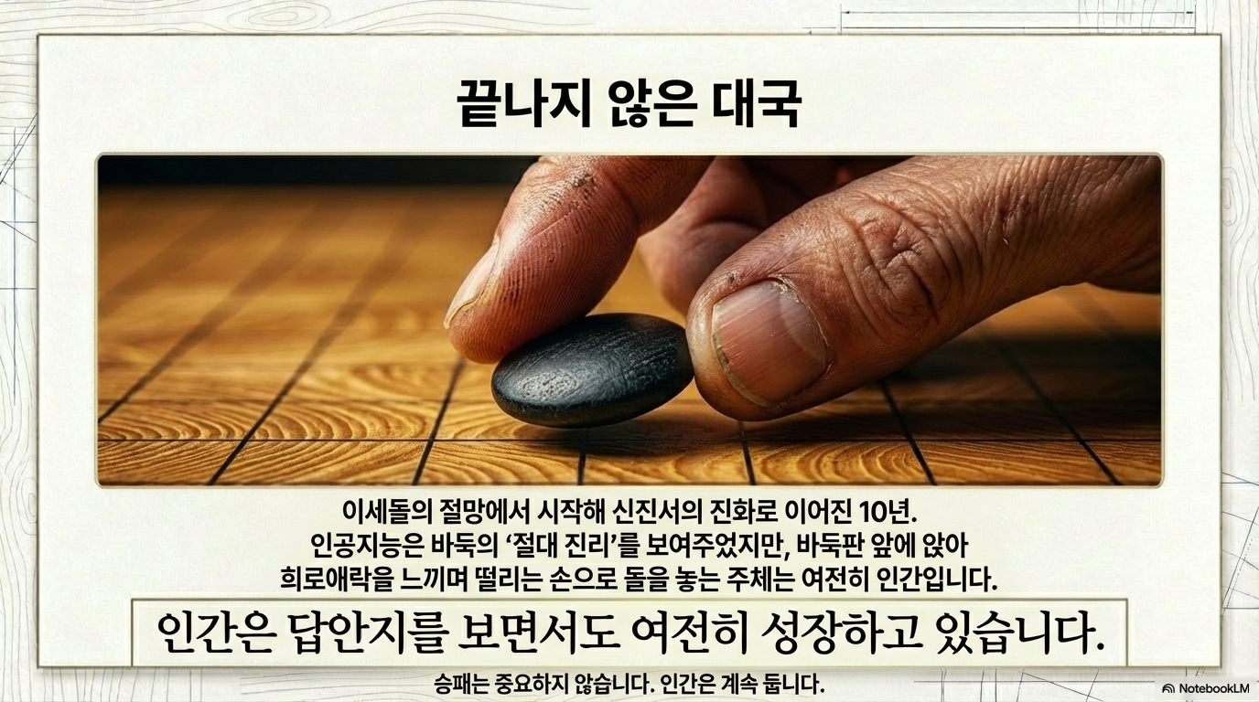 더 이상 인간과 컴퓨터의 대결은 무의미해졌다. 이제 인간에게 남은 과제는 AI라는 압도적인 존재의 수를 조금이라도 이해하고 배우는 것뿐이다.